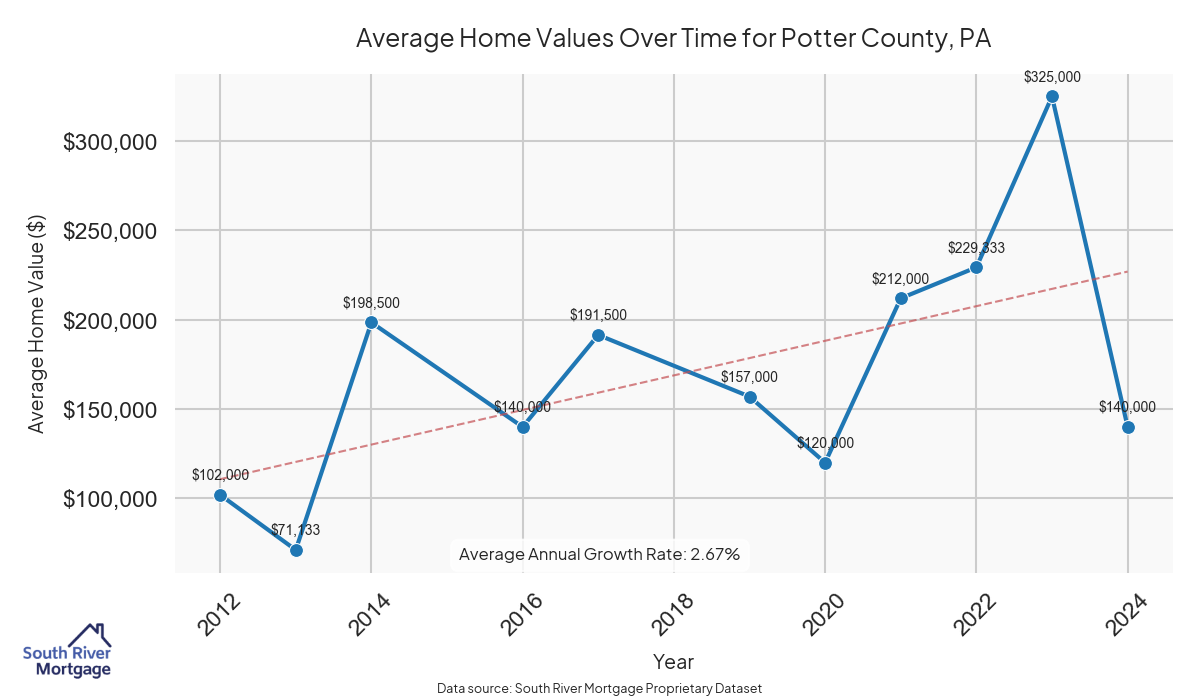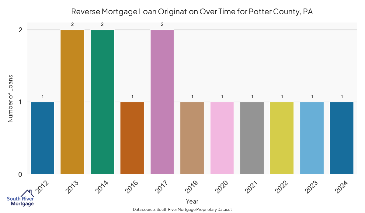 In 2024, there were 14 active reverse mortgage loans in Potter County, Pennsylvania. The average home value in Potter County is $158,725.71.
