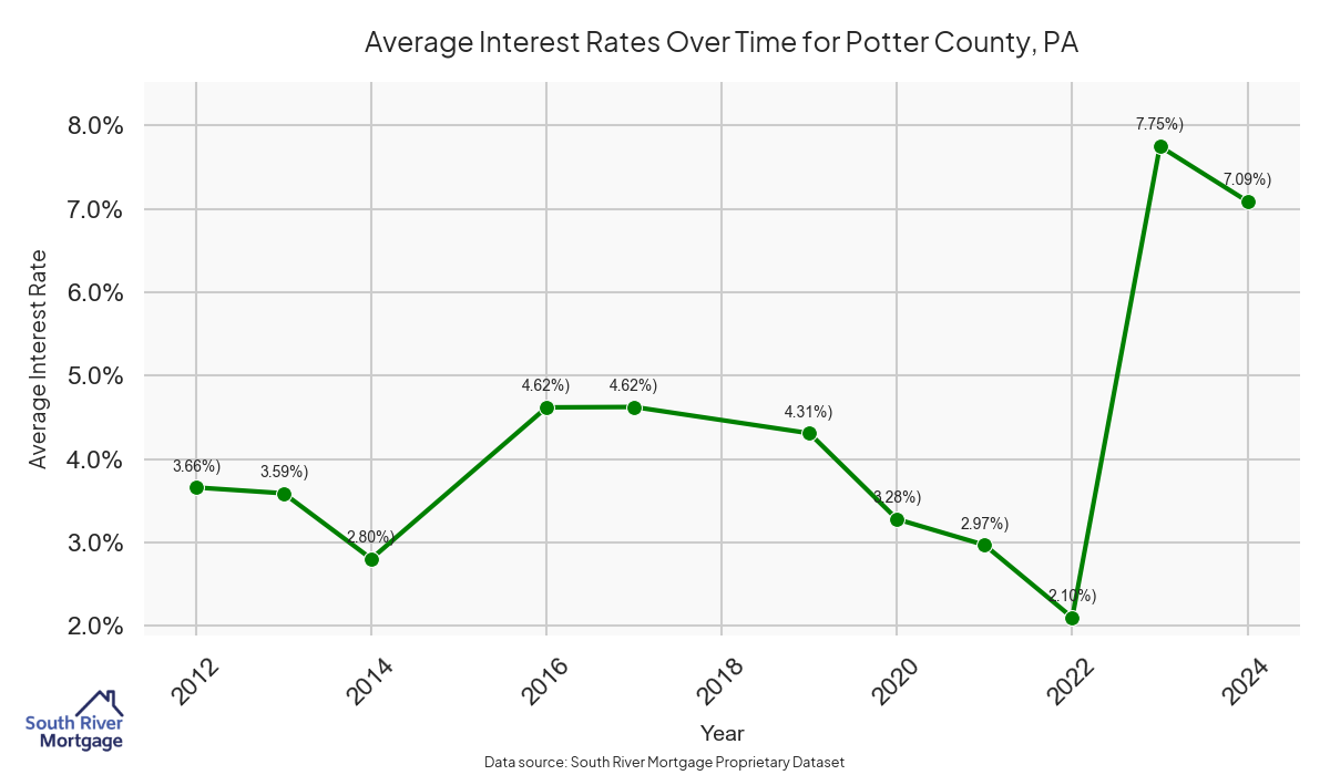 There are approximately 14 active reverse mortgage loans in Potter County. The average interest rate in Potter County is 7.75% for reverse mortgages. The average maximum claim amount (the lesser of the appraisal or lending limit), among reverse mortgage borrowers, in Potter County was $325,000.00 in 2024.