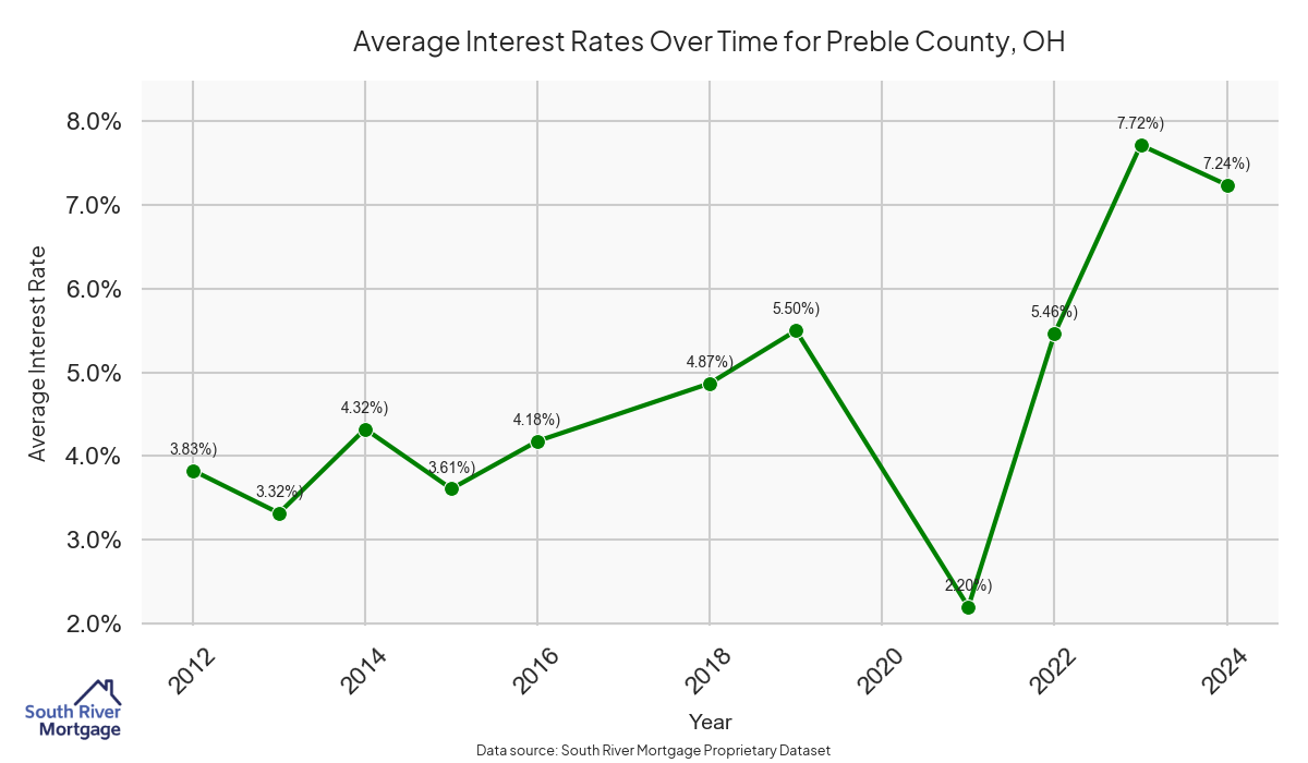 There are approximately 19 active reverse mortgage loans in Preble County. The average interest rate in Preble County is 7.76% for reverse mortgages. The average maximum claim amount (the lesser of the appraisal or lending limit), among reverse mortgage borrowers, in Preble County was $340,000.00 in 2024.