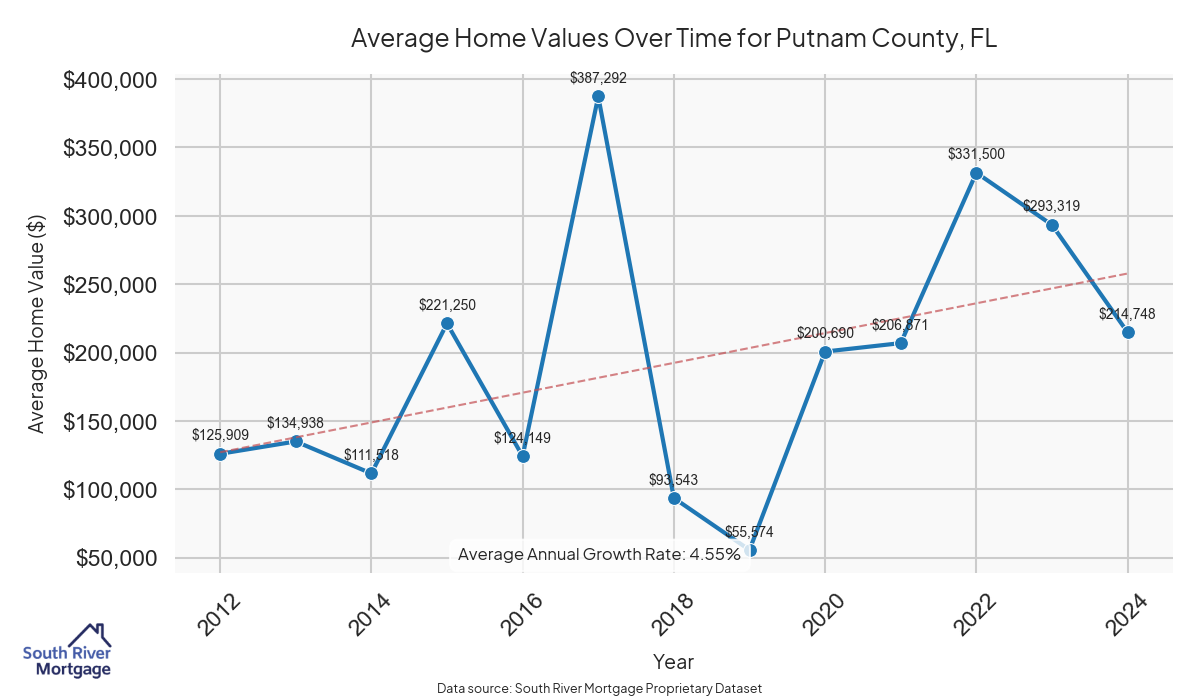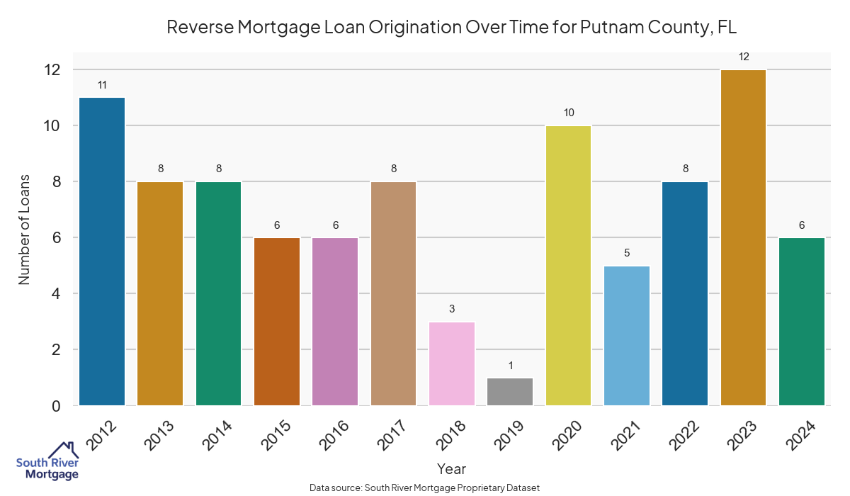 In 2024, there were 86 active reverse mortgage loans in Putnam County, Florida. The average home value in Putnam County is $249,948.30.