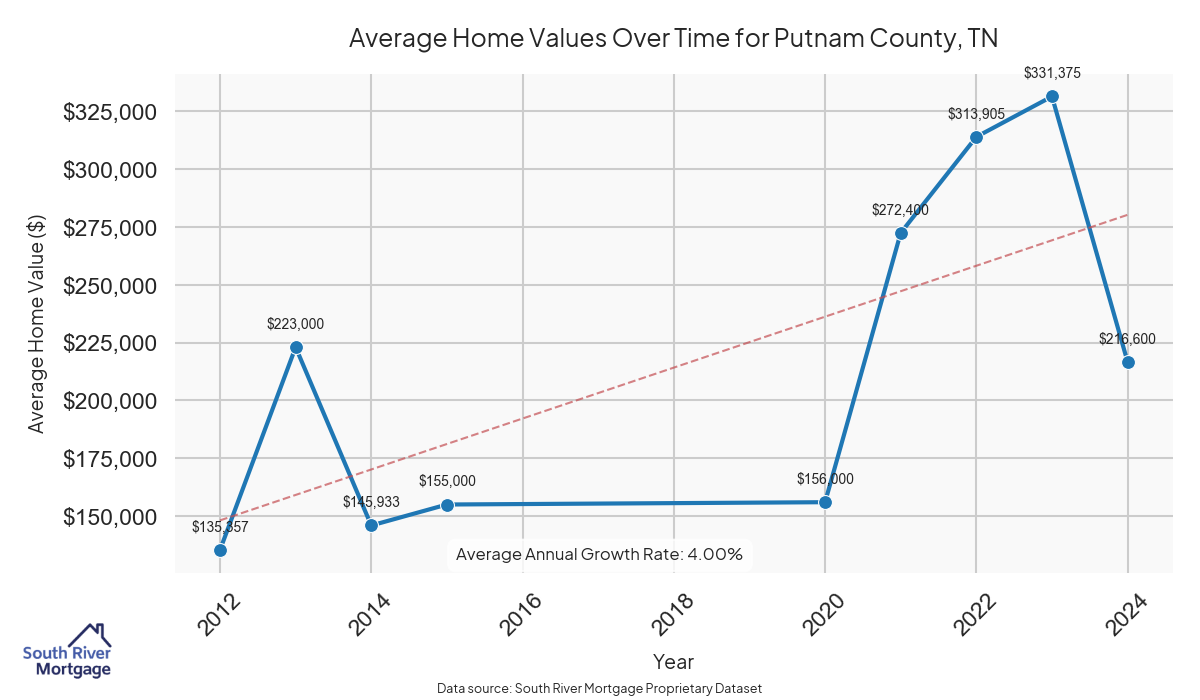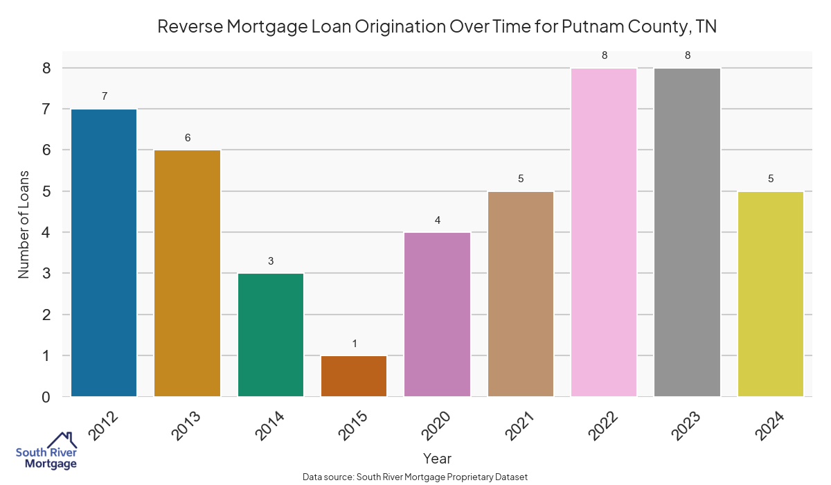In 2024, there were 45 active reverse mortgage loans in Putnam County, Tennessee. The average home value in Putnam County is $343,379.71.