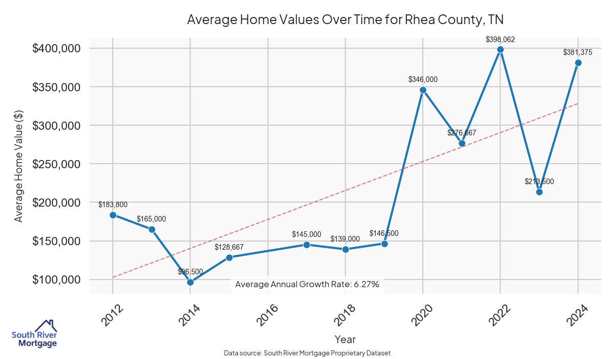 In 2024, there were 26 active reverse mortgage loans in Rhea County, Tennessee. The average home value in Rhea County is $355,095.31.