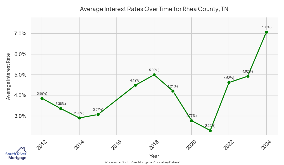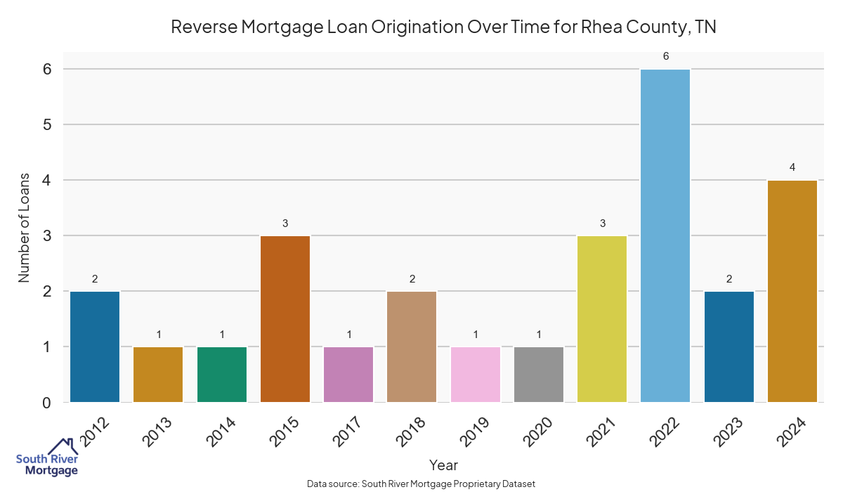 There are approximately 26 active reverse mortgage loans in Rhea County. The average interest rate in Rhea County is 6.91% for reverse mortgages. The average maximum claim amount (the lesser of the appraisal or lending limit), among reverse mortgage borrowers, in Rhea County was $287,500.00 in 2024.