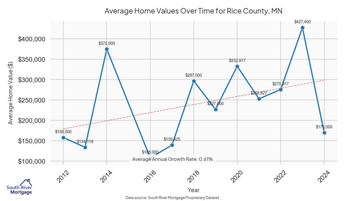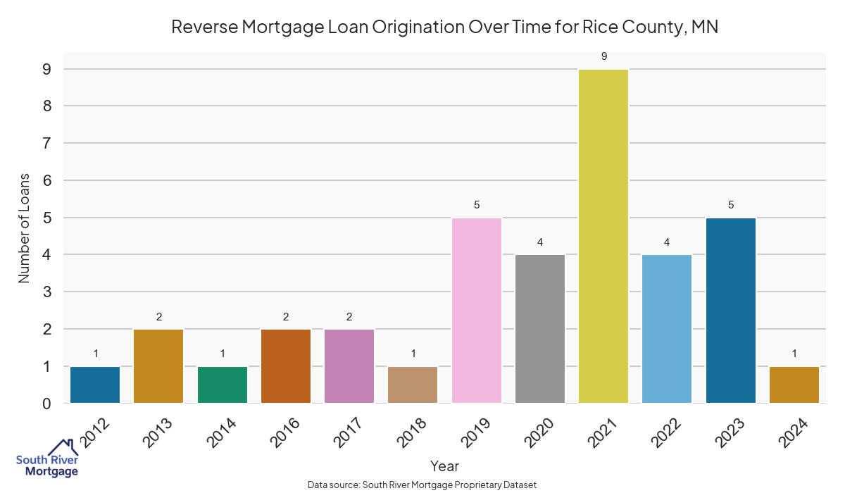 In 2024, there were 37 active reverse mortgage loans in Rice County, Minnesota. The average home value in Rice County is $375,219.41.