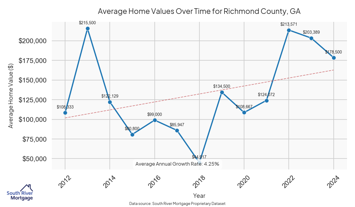 In 2024, there were 60 active reverse mortgage loans in Richmond County, Georgia. The average home value in Richmond County is $176,506.03.