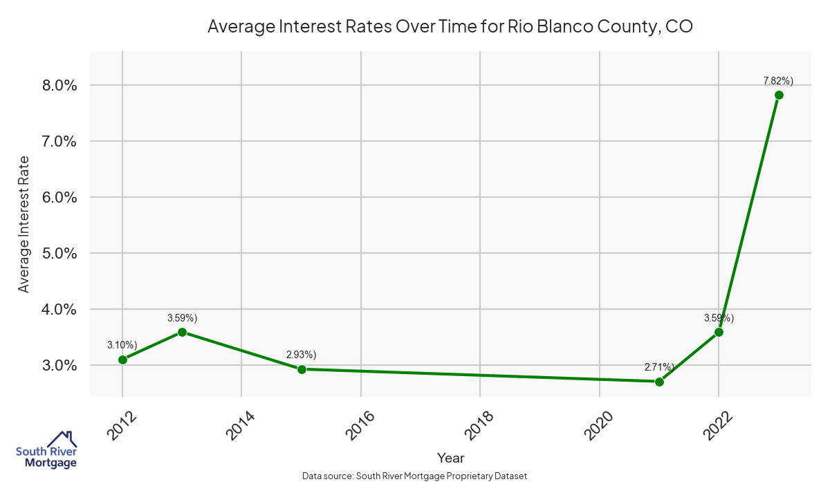 There are approximately 10 active reverse mortgage loans in Rio Blanco County. The average interest rate in Rio Blanco County is 7.82% for reverse mortgages. The average maximum claim amount (the lesser of the appraisal or lending limit), among reverse mortgage borrowers, in Rio Blanco County was $175,000.00 in 2024.