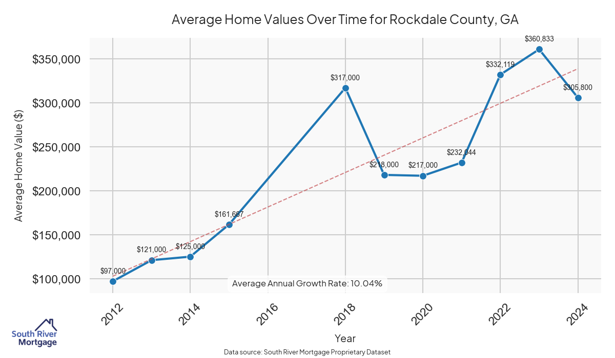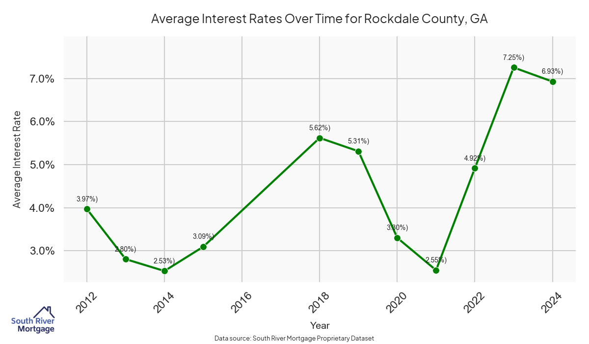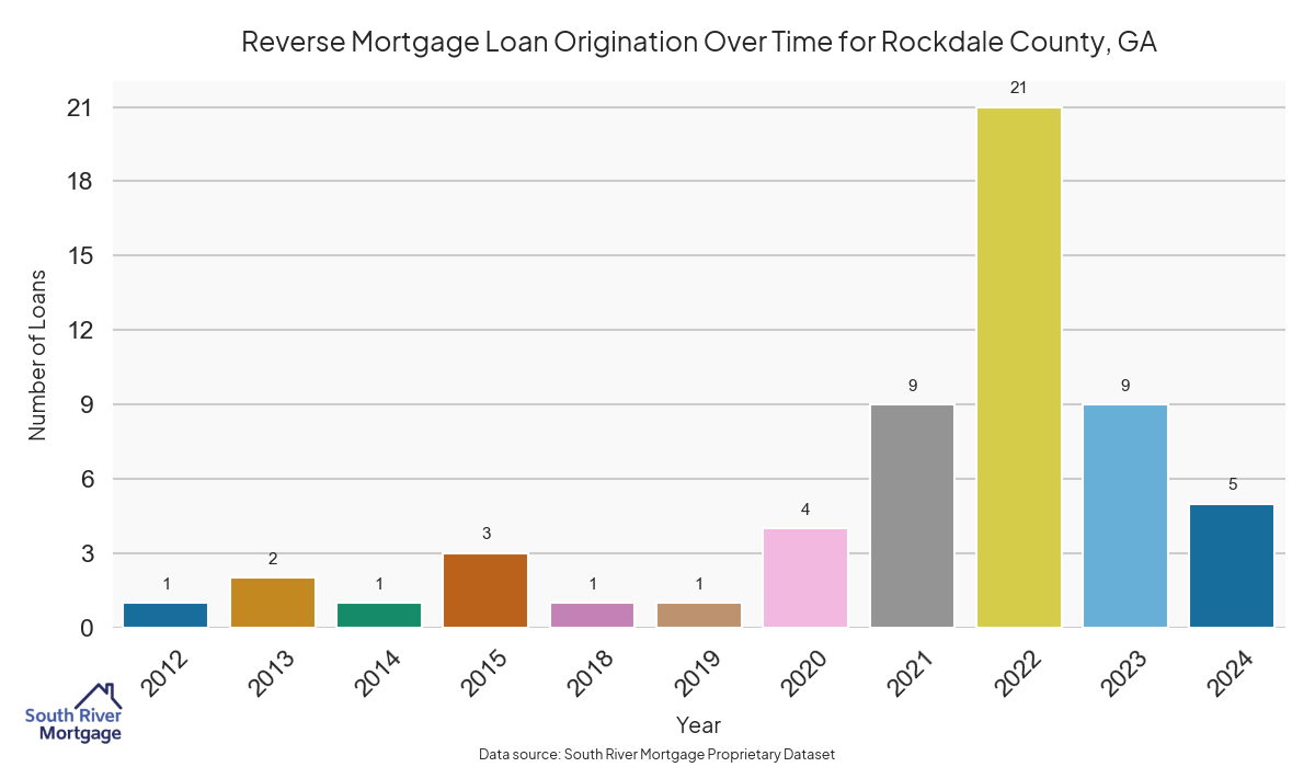 There are approximately 57 active reverse mortgage loans in Rockdale County. The average interest rate in Rockdale County is 7.61% for reverse mortgages. The average maximum claim amount (the lesser of the appraisal or lending limit), among reverse mortgage borrowers, in Rockdale County was $317,500.00 in 2024.
