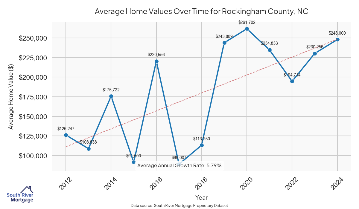 In 2024, there were 88 active reverse mortgage loans in Rockingham County, North Carolina. The average home value in Rockingham County is $278,677.61.
