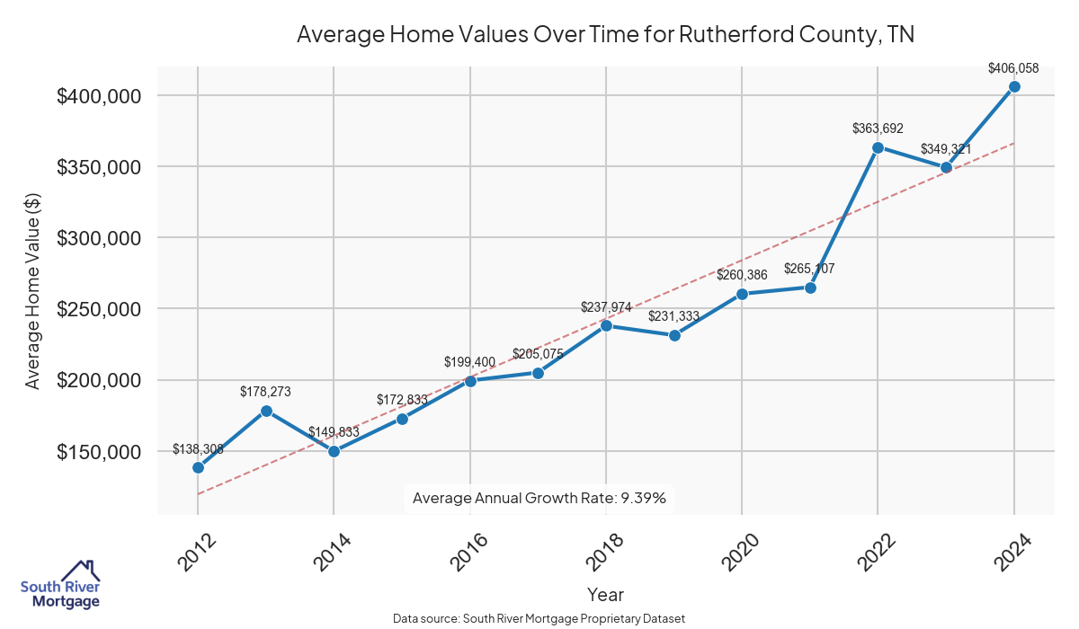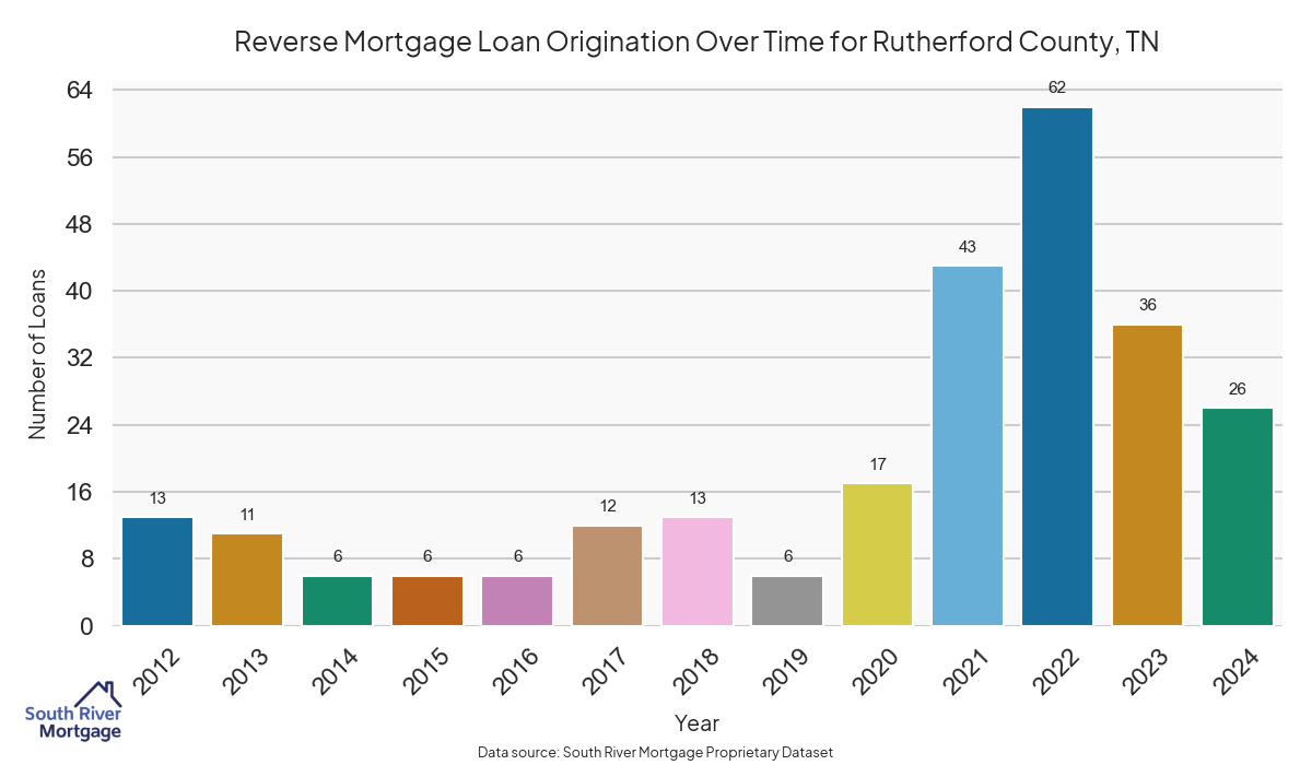 In 2024, there were 257 active reverse mortgage loans in Rutherford County, Tennessee. The average home value in Rutherford County is $409,330.72.