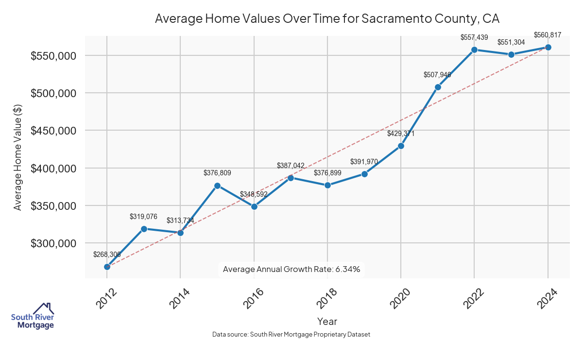 In 2024, there were 2346 active reverse mortgage loans in Sacramento County, California. The average home value in Sacramento County is $549,977.93.