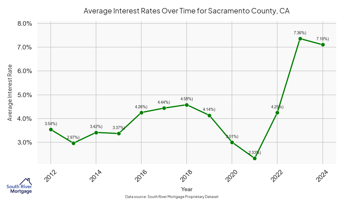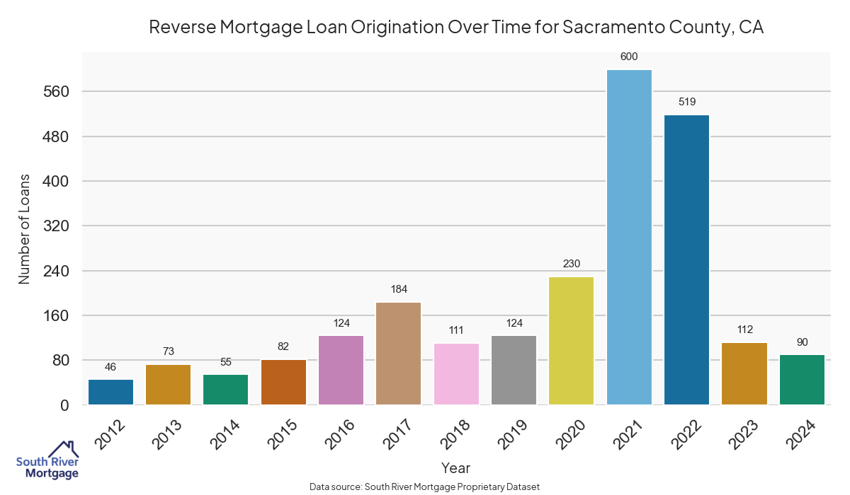 There are approximately 2346 active reverse mortgage loans in Sacramento County. The average interest rate in Sacramento County is 7.44% for reverse mortgages. The average maximum claim amount (the lesser of the appraisal or lending limit), among reverse mortgage borrowers, in Sacramento County was $551,857.14 in 2024.