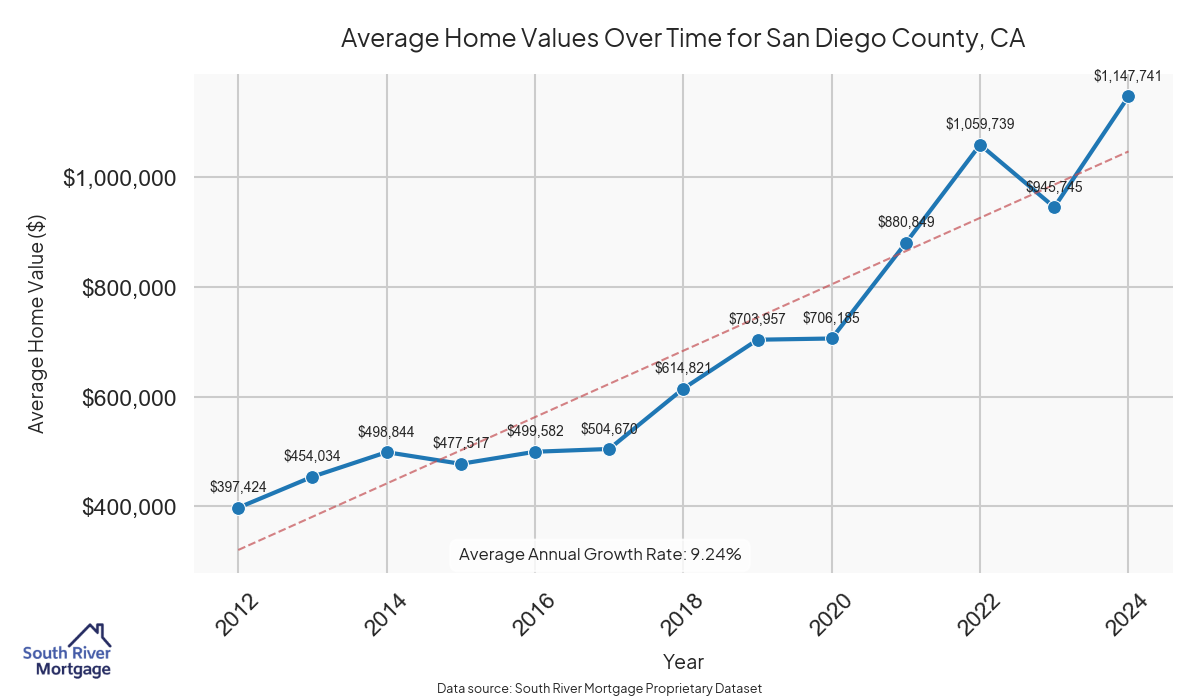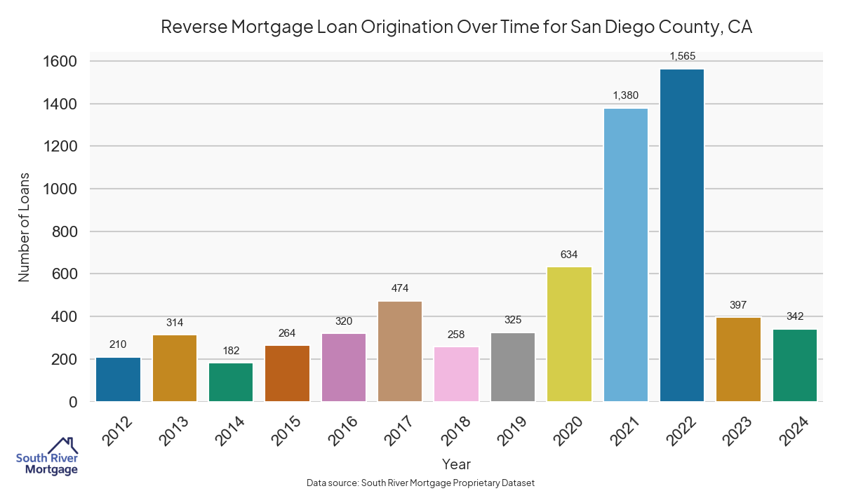 In 2024, there were 6635 active reverse mortgage loans in San Diego County, California. The average home value in San Diego County is $1,041,731.38.