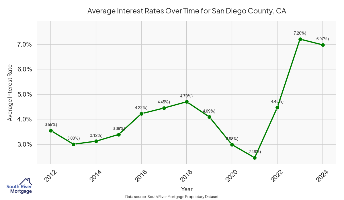 There are approximately 6635 active reverse mortgage loans in San Diego County. The average interest rate in San Diego County is 7.75% for reverse mortgages. The average maximum claim amount (the lesser of the appraisal or lending limit), among reverse mortgage borrowers, in San Diego County was $1,055,805.20 in 2024.