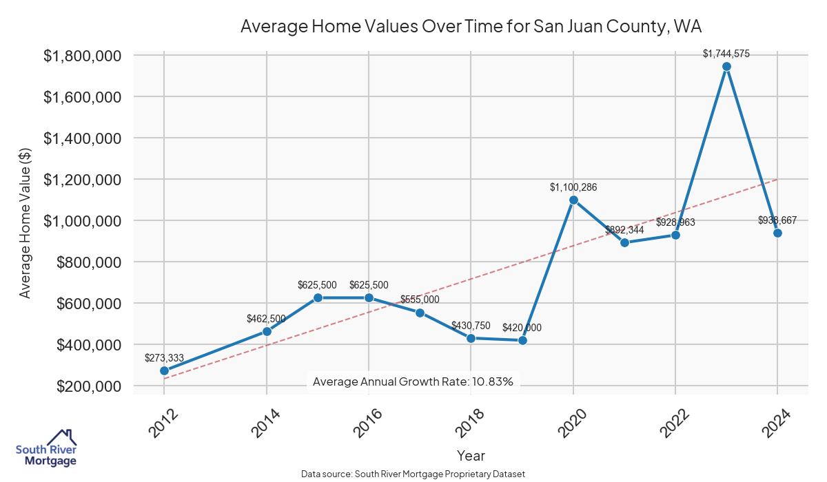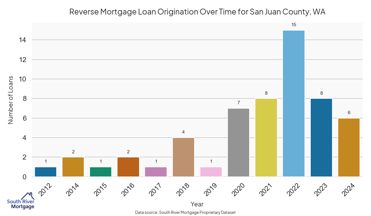 In 2024, there were 51 active reverse mortgage loans in San Juan County, Washington. The average home value in San Juan County is $1,483,257.80.