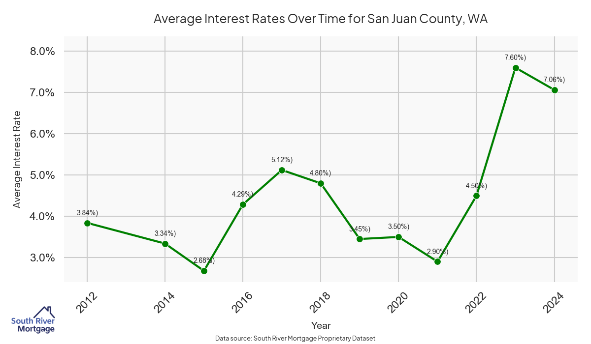 There are approximately 51 active reverse mortgage loans in San Juan County. The average interest rate in San Juan County is 8.38% for reverse mortgages. The average maximum claim amount (the lesser of the appraisal or lending limit), among reverse mortgage borrowers, in San Juan County was $1,896,428.57 in 2024.