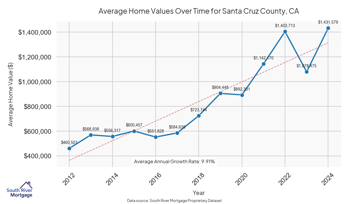 In 2024, there were 569 active reverse mortgage loans in Santa Cruz County, California. The average home value in Santa Cruz County is $1,205,324.37.