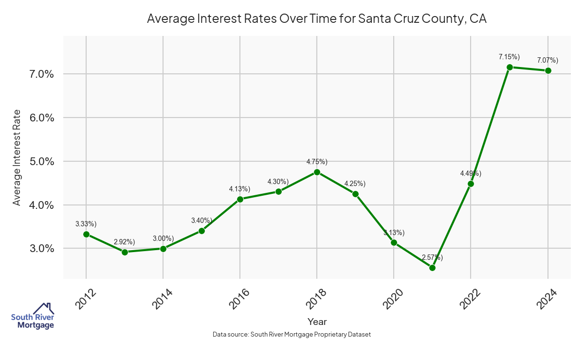 There are approximately 569 active reverse mortgage loans in Santa Cruz County. The average interest rate in Santa Cruz County is 7.96% for reverse mortgages. The average maximum claim amount (the lesser of the appraisal or lending limit), among reverse mortgage borrowers, in Santa Cruz County was $1,396,392.41 in 2024.
