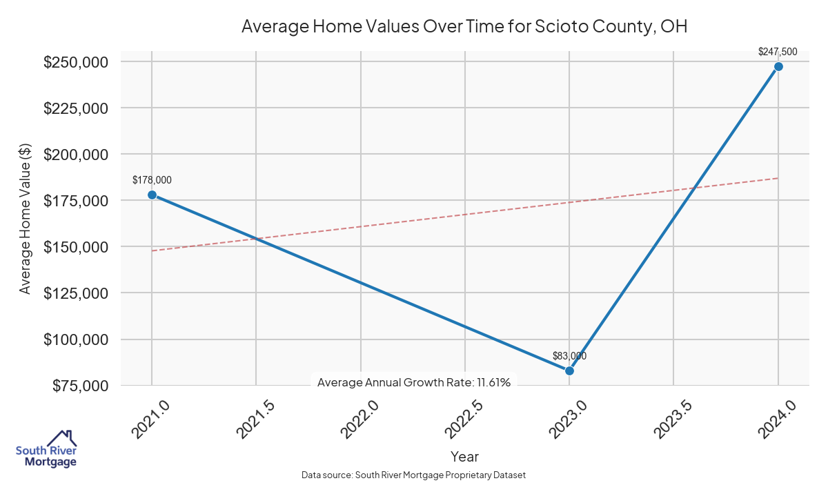 In 2024, there were 6 active reverse mortgage loans in Scioto County, Ohio. The average home value in Scioto County is $121,138.33.
