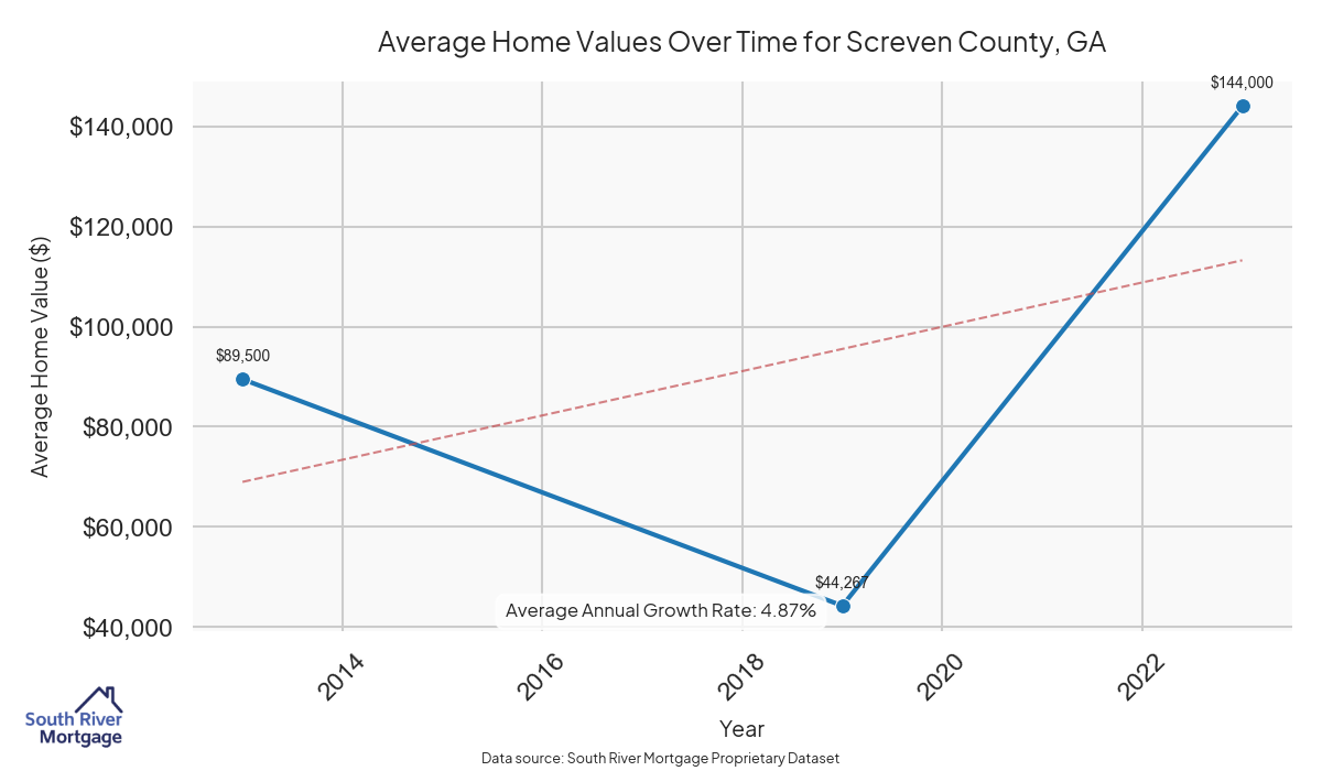 In 2024, there were 3 active reverse mortgage loans in Screven County, Georgia. The average home value in Screven County is $75,229.00.