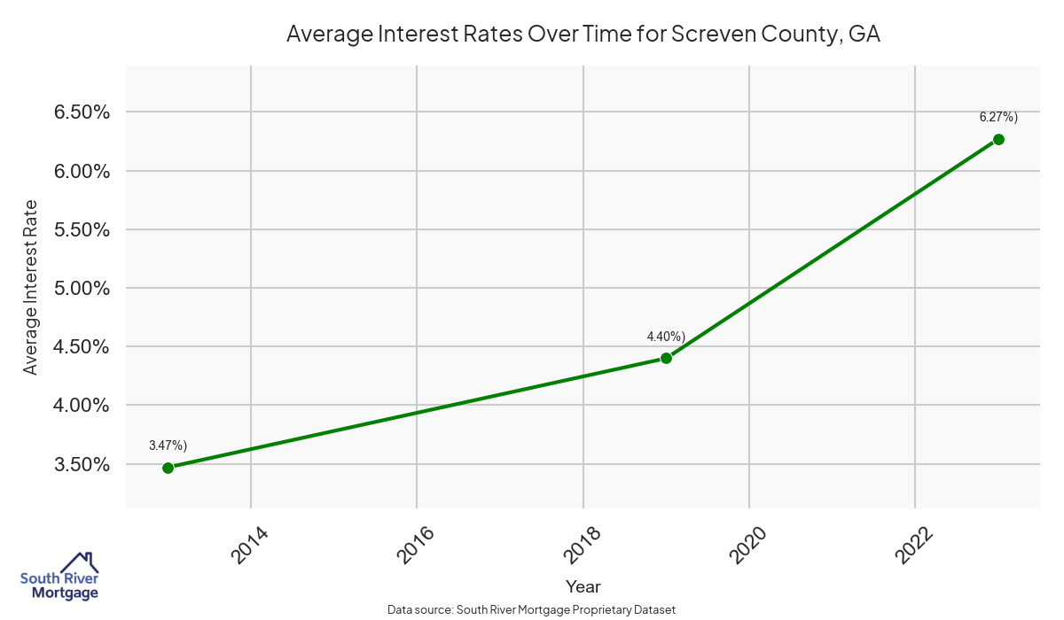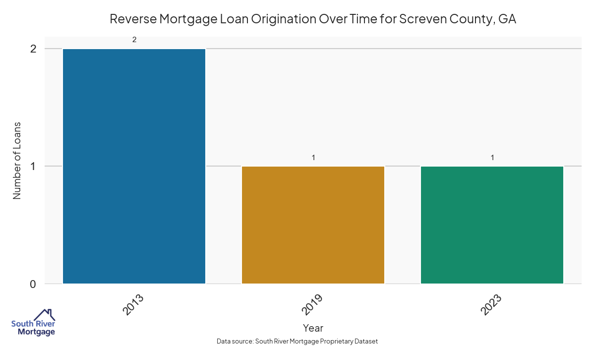 There are approximately 3 active reverse mortgage loans in Screven County. The average interest rate in Screven County is 6.18% for reverse mortgages. The average maximum claim amount (the lesser of the appraisal or lending limit), among reverse mortgage borrowers, in Screven County was $165,000.00 in 2024.