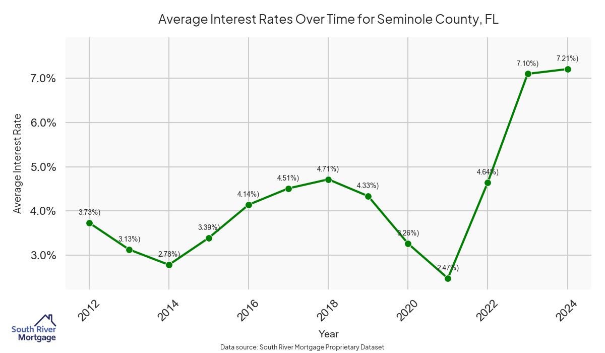 There are approximately 542 active reverse mortgage loans in Seminole County. The average interest rate in Seminole County is 7.32% for reverse mortgages. The average maximum claim amount (the lesser of the appraisal or lending limit), among reverse mortgage borrowers, in Seminole County was $433,208.96 in 2024.