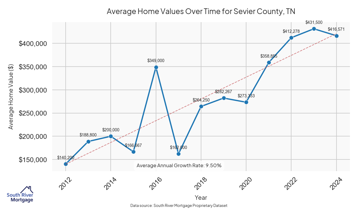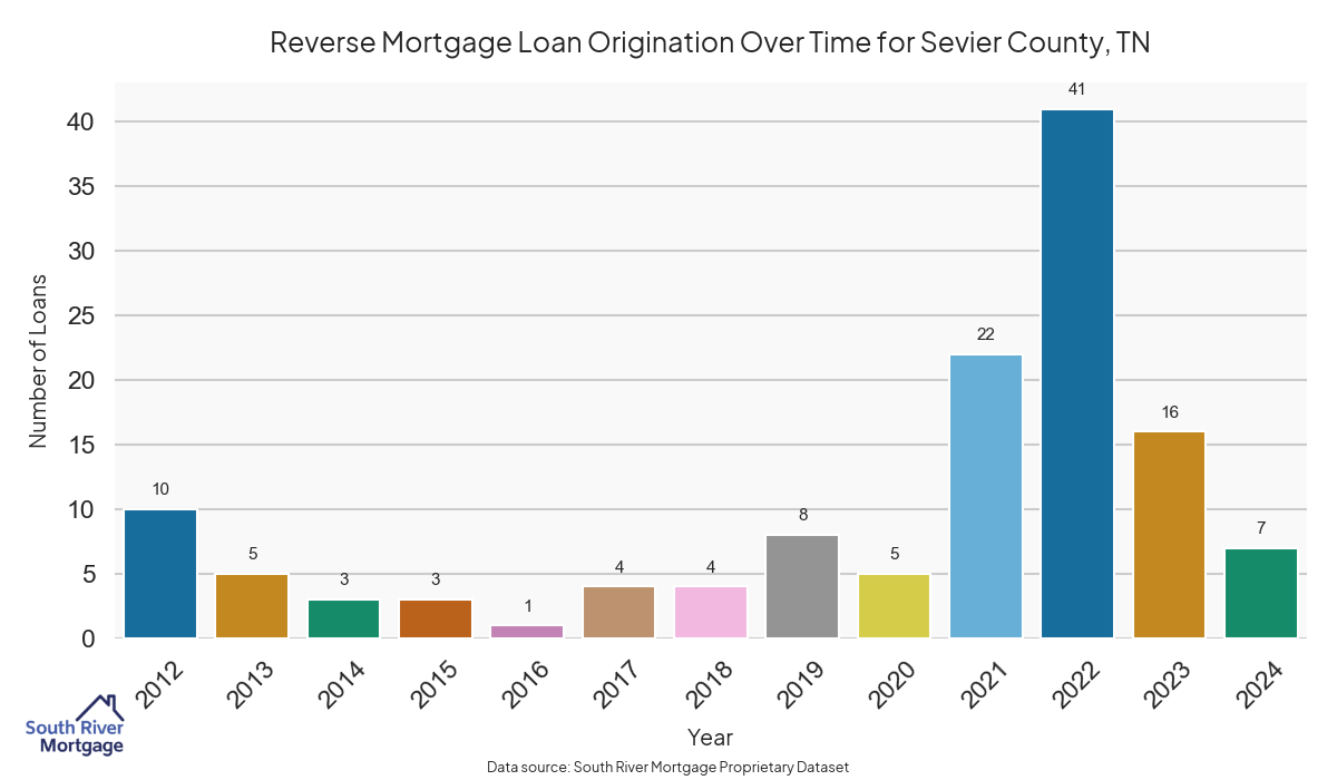 In 2024, there were 125 active reverse mortgage loans in Sevier County, Tennessee. The average home value in Sevier County is $417,297.74.