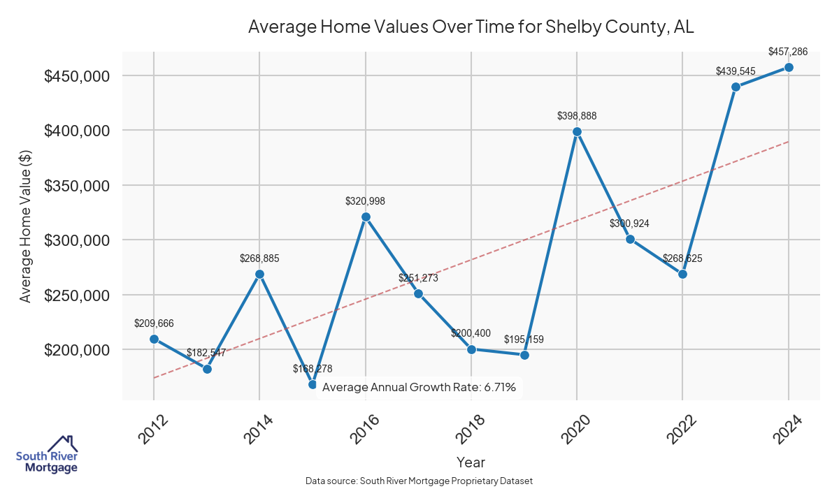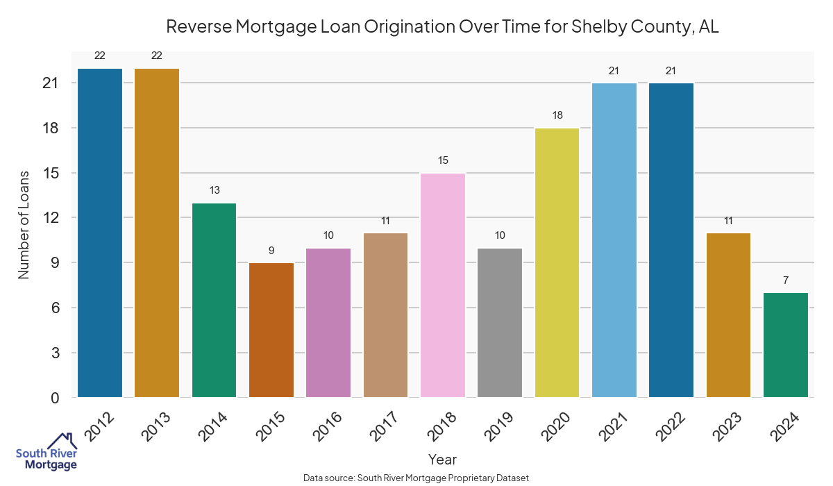 In 2024, there were 188 active reverse mortgage loans in Shelby County, Alabama. The average home value in Shelby County is $378,394.57.