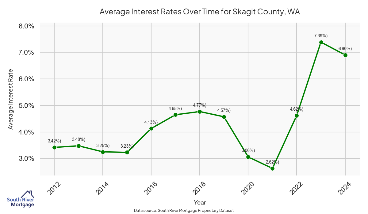 There are approximately 233 active reverse mortgage loans in Skagit County. The average interest rate in Skagit County is 7.45% for reverse mortgages. The average maximum claim amount (the lesser of the appraisal or lending limit), among reverse mortgage borrowers, in Skagit County was $628,928.57 in 2024.
