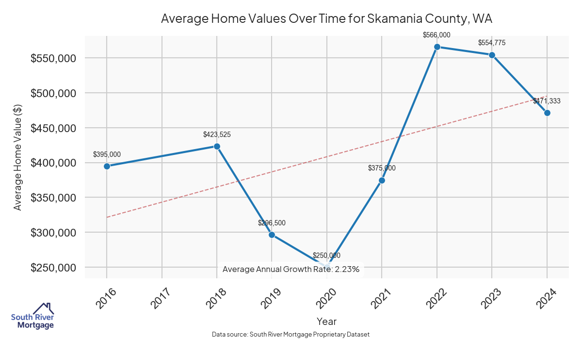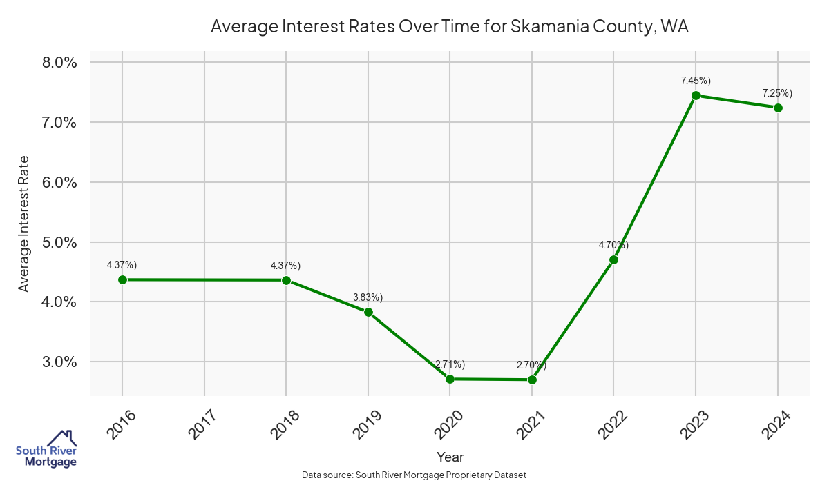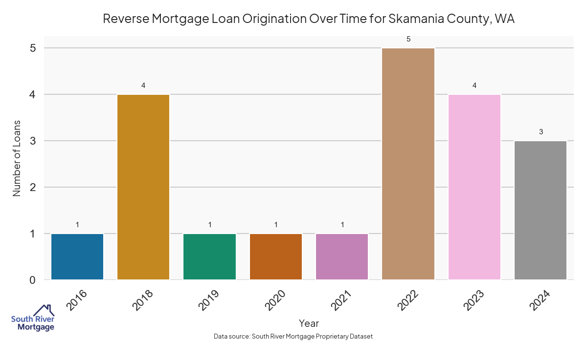 There are approximately 19 active reverse mortgage loans in Skamania County. The average interest rate in Skamania County is 7.42% for reverse mortgages. The average maximum claim amount (the lesser of the appraisal or lending limit), among reverse mortgage borrowers, in Skamania County was $1,031,666.67 in 2024.