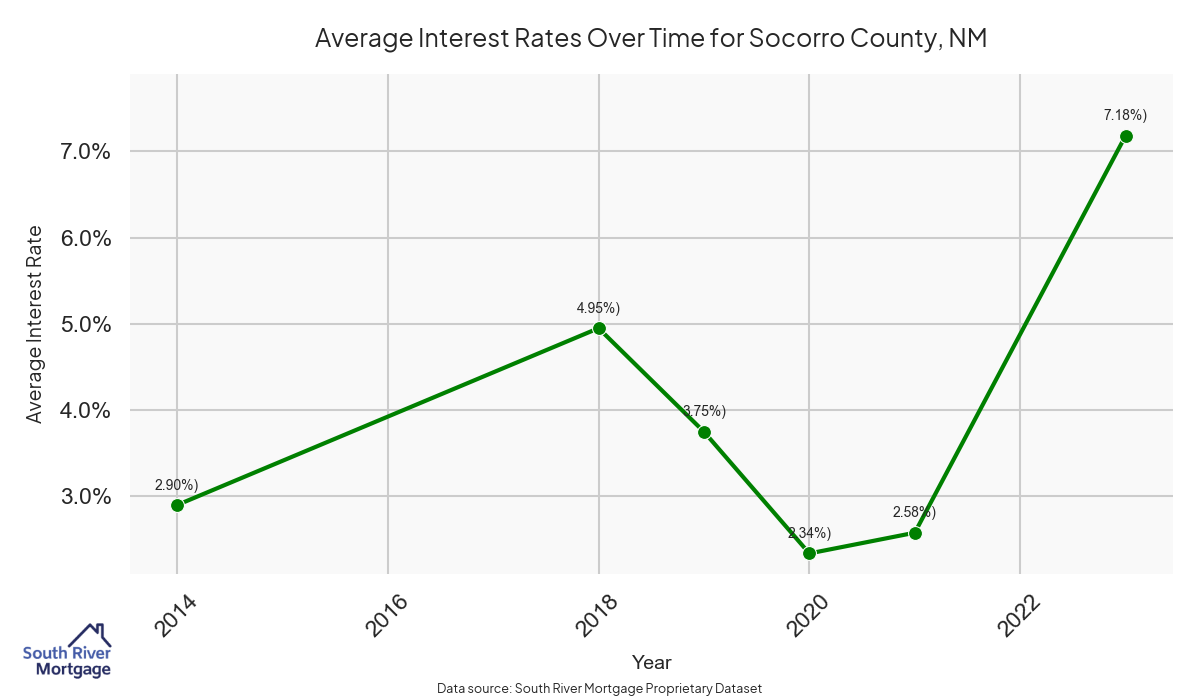 There are approximately 6 active reverse mortgage loans in Socorro County. The average interest rate in Socorro County is 7.18% for reverse mortgages. The average maximum claim amount (the lesser of the appraisal or lending limit), among reverse mortgage borrowers, in Socorro County was $135,000.00 in 2024.