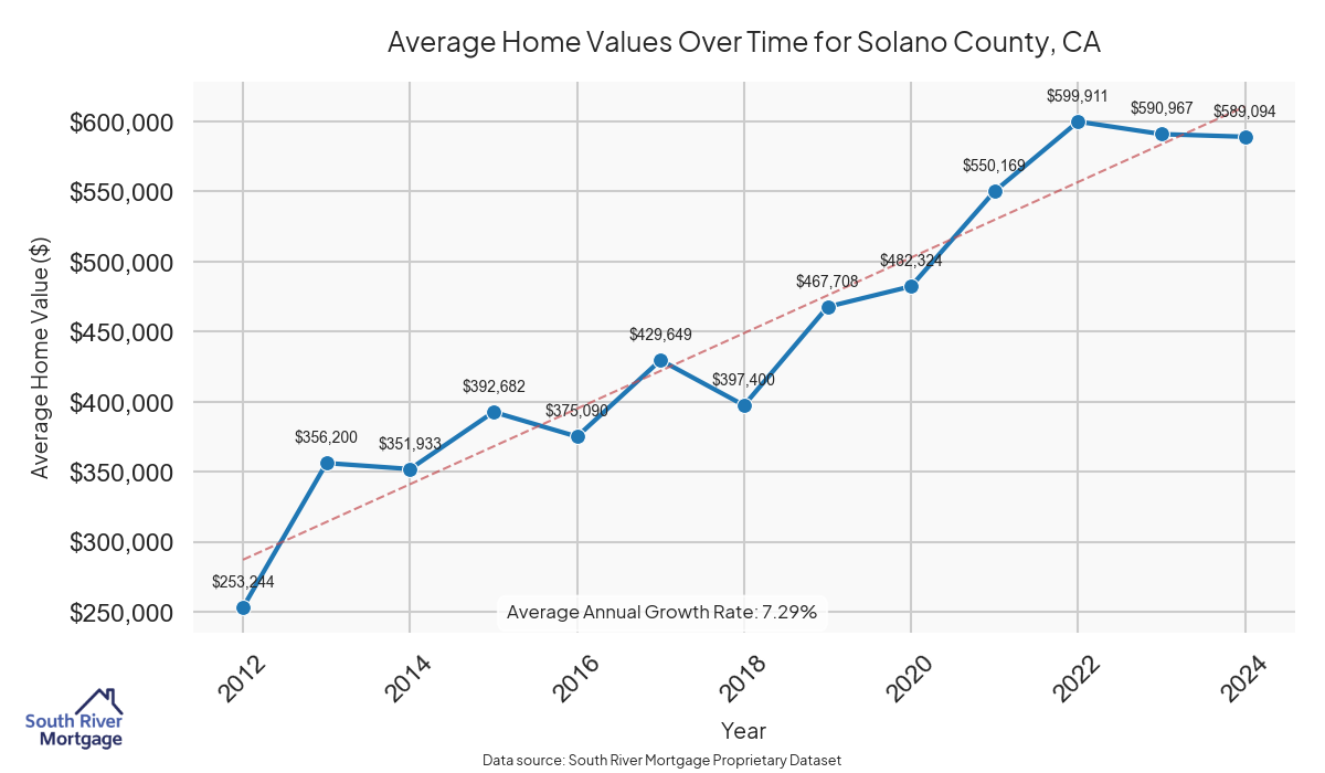 In 2024, there were 807 active reverse mortgage loans in Solano County, California. The average home value in Solano County is $591,575.31.