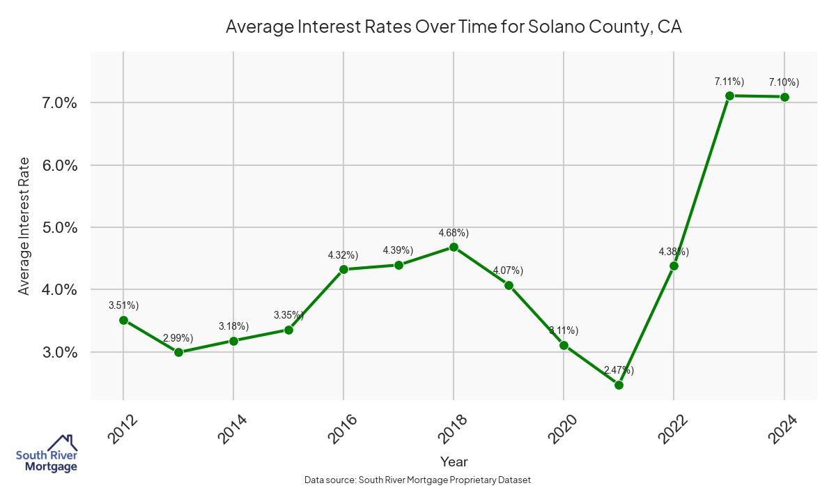 There are approximately 807 active reverse mortgage loans in Solano County. The average interest rate in Solano County is 7.44% for reverse mortgages. The average maximum claim amount (the lesser of the appraisal or lending limit), among reverse mortgage borrowers, in Solano County was $592,200.00 in 2024.