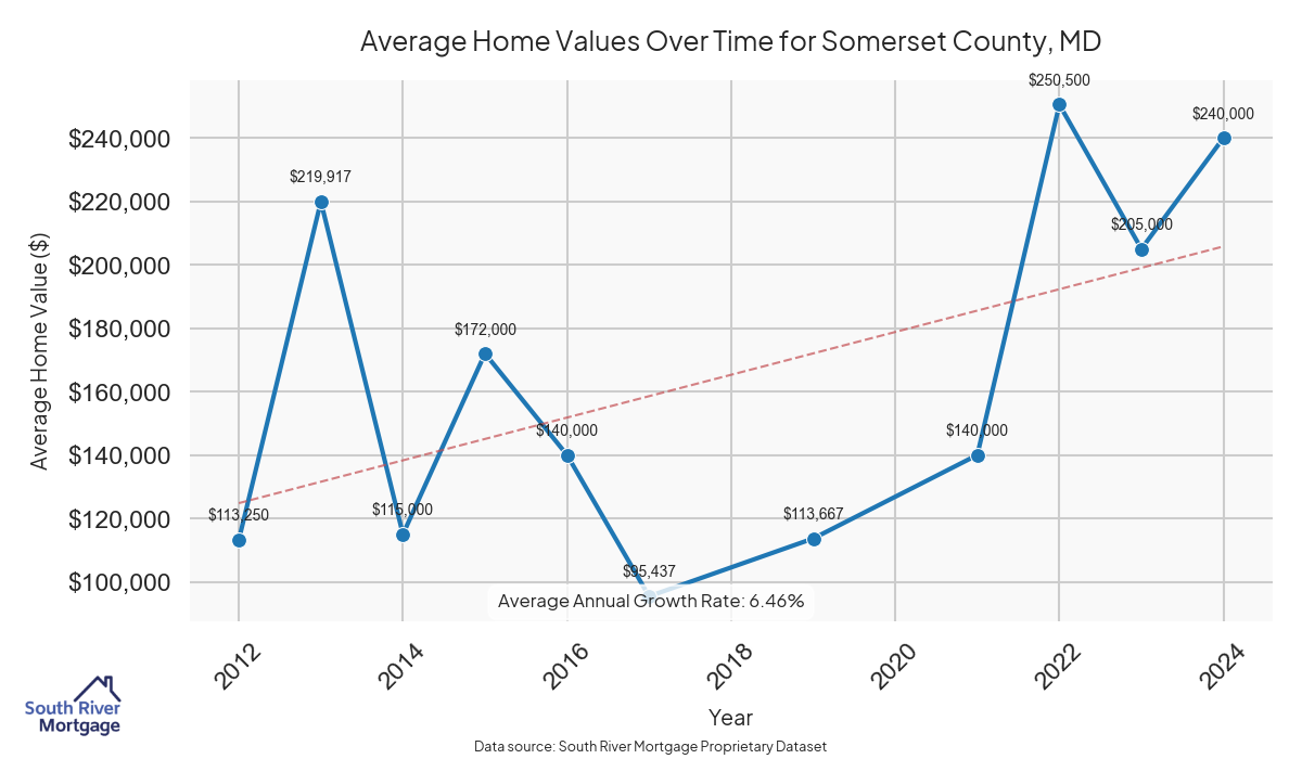 In 2024, there were 27 active reverse mortgage loans in Somerset County, Maryland. The average home value in Somerset County is $154,599.89.