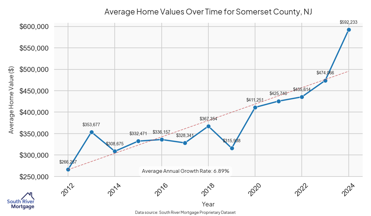 In 2024, there were 221 active reverse mortgage loans in Somerset County, New Jersey. The average home value in Somerset County is $636,413.81.