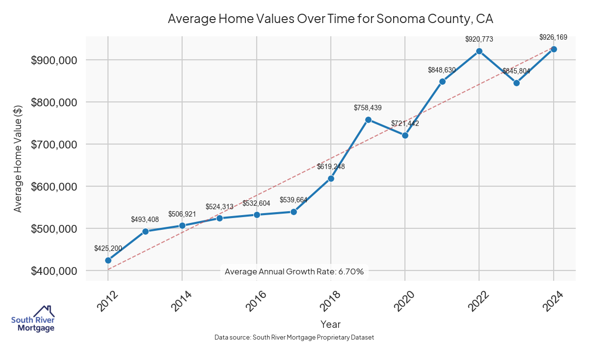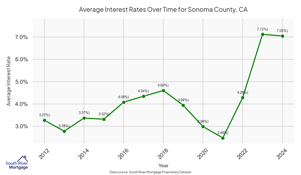 There are approximately 1331 active reverse mortgage loans in Sonoma County. The average interest rate in Sonoma County is 7.45% for reverse mortgages. The average maximum claim amount (the lesser of the appraisal or lending limit), among reverse mortgage borrowers, in Sonoma County was $898,934.43 in 2024.