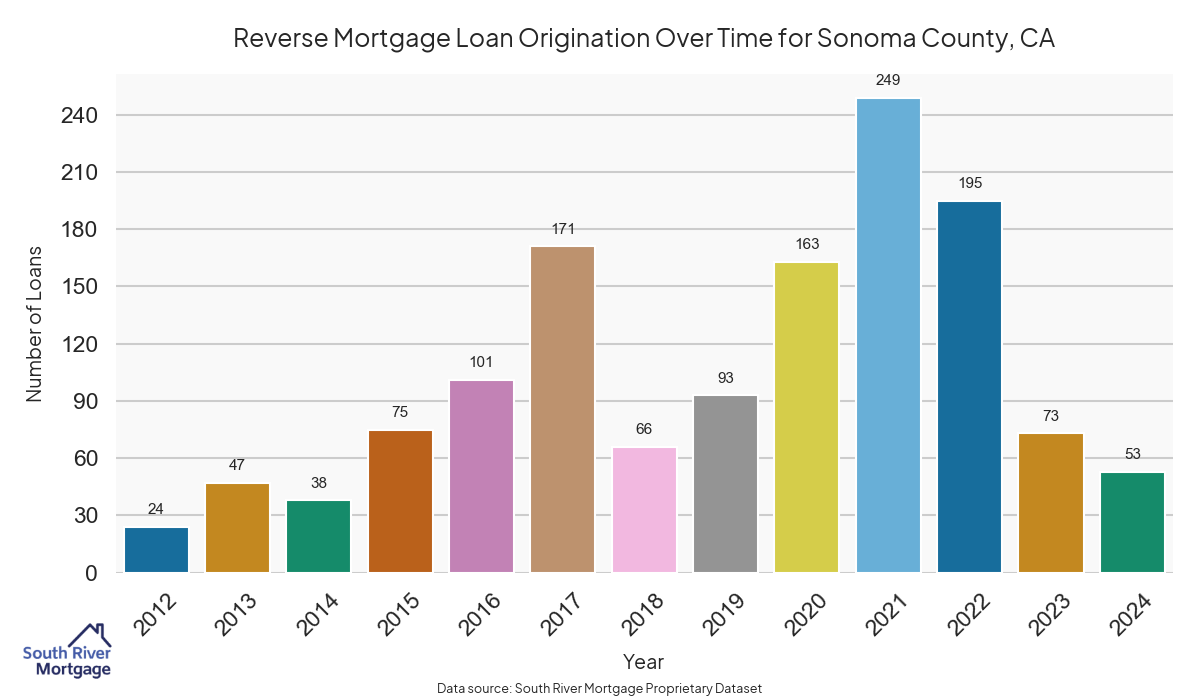 In 2024, there were 1331 active reverse mortgage loans in Sonoma County, California. The average home value in Sonoma County is $815,726.36.