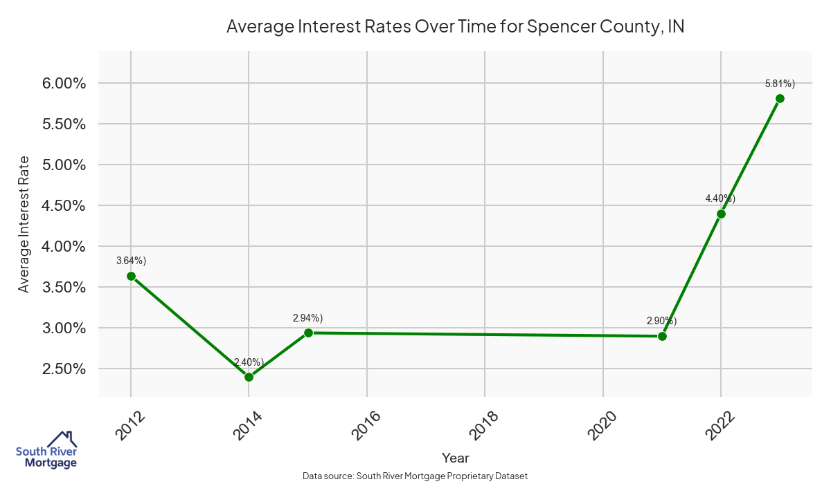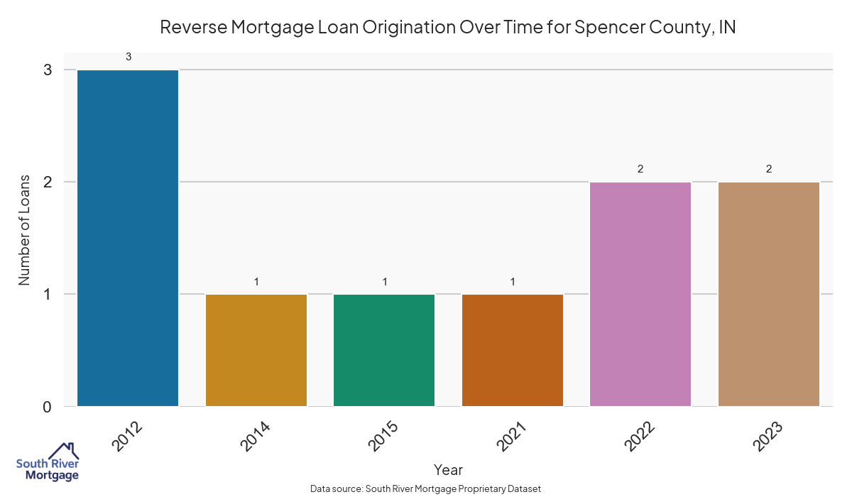 There are approximately 10 active reverse mortgage loans in Spencer County. The average interest rate in Spencer County is 7.62% for reverse mortgages. The average maximum claim amount (the lesser of the appraisal or lending limit), among reverse mortgage borrowers, in Spencer County was $215,000.00 in 2024.