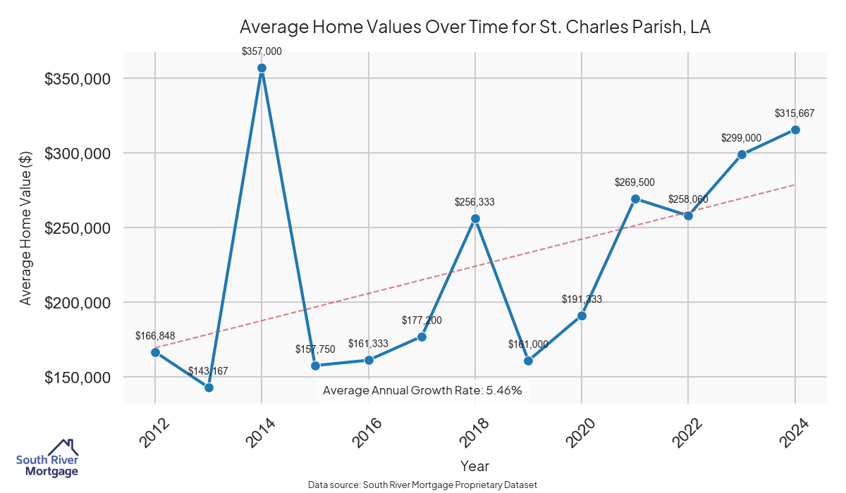 In 2024, there were 56 active reverse mortgage loans in St. Charles Parish, Louisiana. The average home value in St. Charles Parish is $245,965.54.