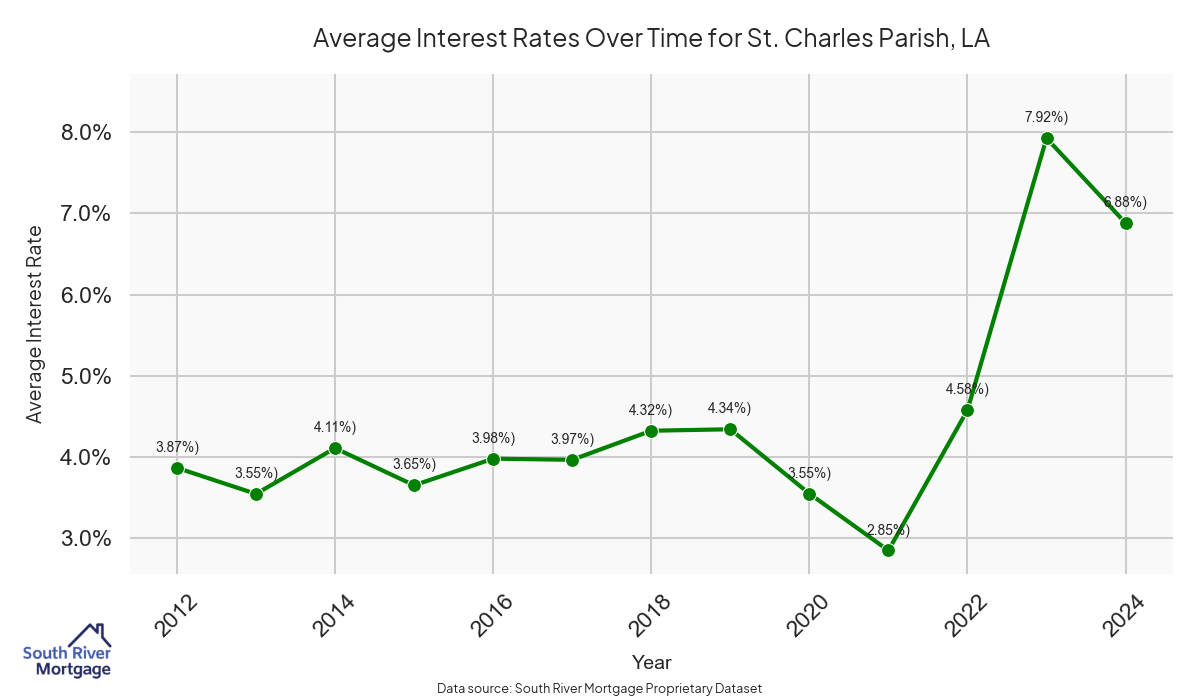There are approximately 56 active reverse mortgage loans in St. Charles Parish. The average interest rate in St. Charles Parish is 7.93% for reverse mortgages. The average maximum claim amount (the lesser of the appraisal or lending limit), among reverse mortgage borrowers, in St. Charles Parish was $300,000.00 in 2024.