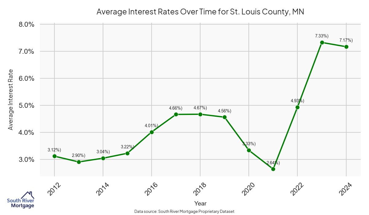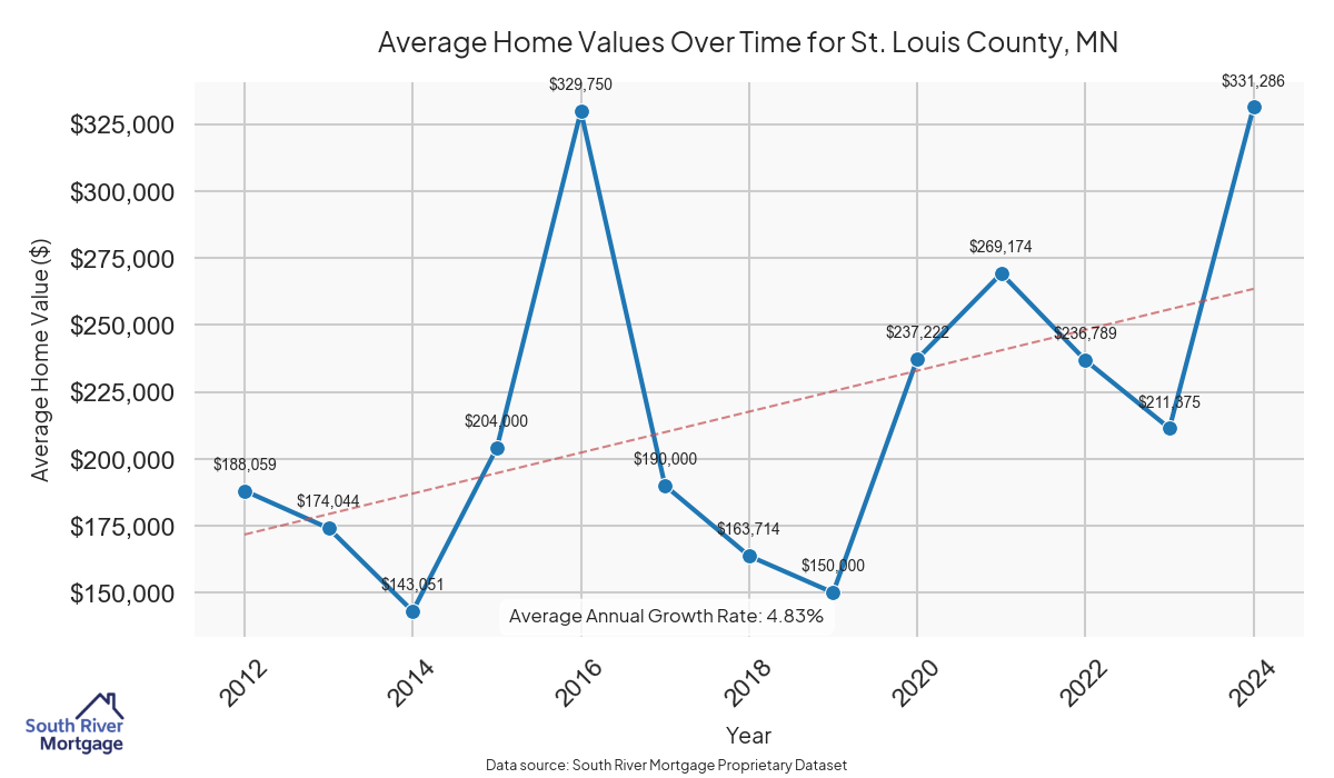 In 2024, there were 124 active reverse mortgage loans in St. Louis County, Minnesota. The average home value in St. Louis County is $324,865.16.