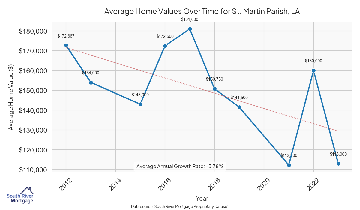 In 2024, there were 17 active reverse mortgage loans in St. Martin Parish, Louisiana. The average home value in St. Martin Parish is $170,523.94.