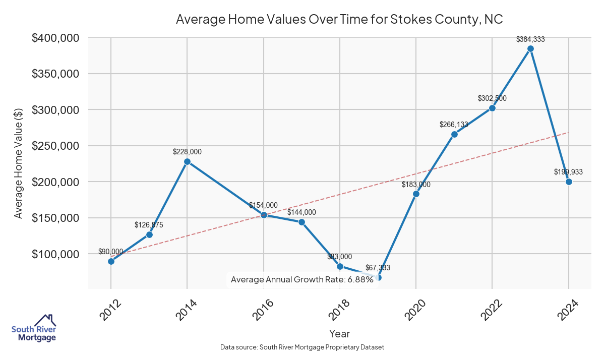 In 2024, there were 39 active reverse mortgage loans in Stokes County, North Carolina. The average home value in Stokes County is $302,763.00.