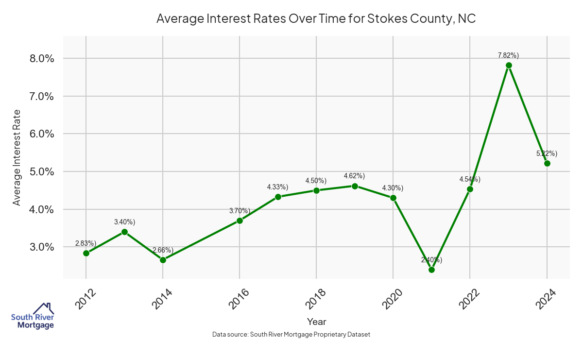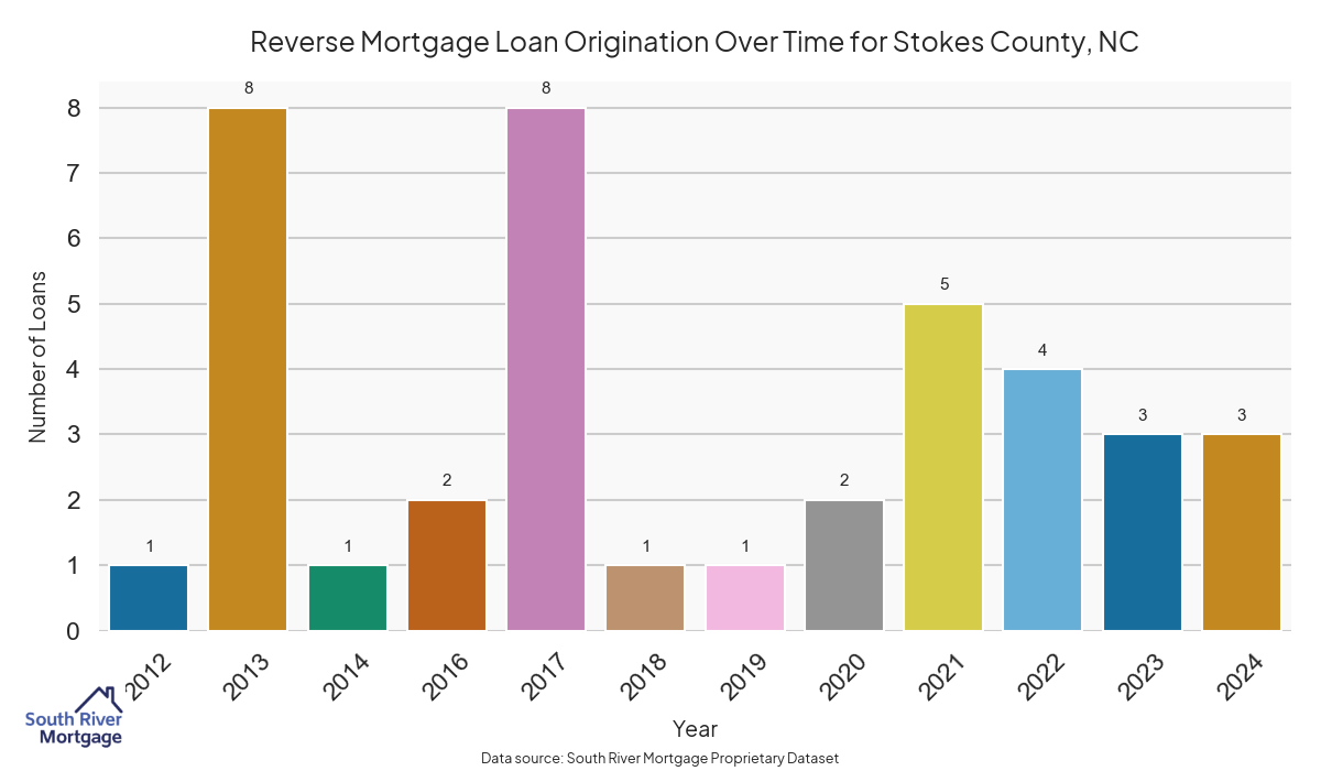 There are approximately 39 active reverse mortgage loans in Stokes County. The average interest rate in Stokes County is 7.45% for reverse mortgages. The average maximum claim amount (the lesser of the appraisal or lending limit), among reverse mortgage borrowers, in Stokes County was $370,000.00 in 2024.