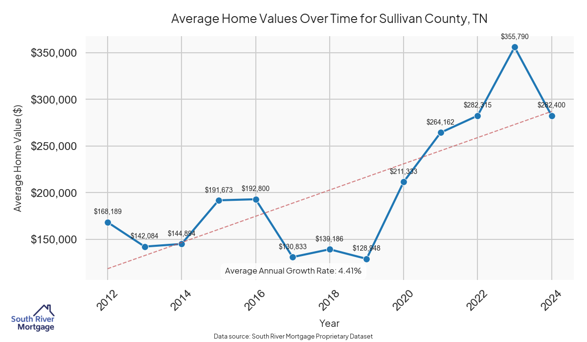In 2024, there were 180 active reverse mortgage loans in Sullivan County, Tennessee. The average home value in Sullivan County is $304,731.92.