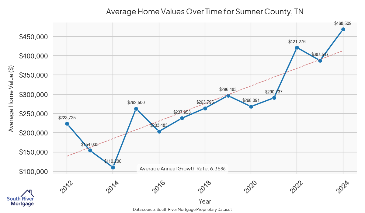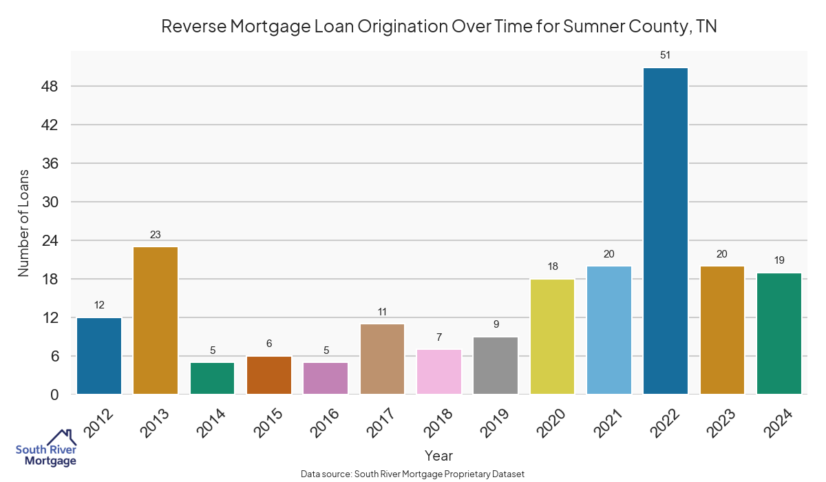 In 2024, there were 204 active reverse mortgage loans in Sumner County, Tennessee. The average home value in Sumner County is $462,303.24.