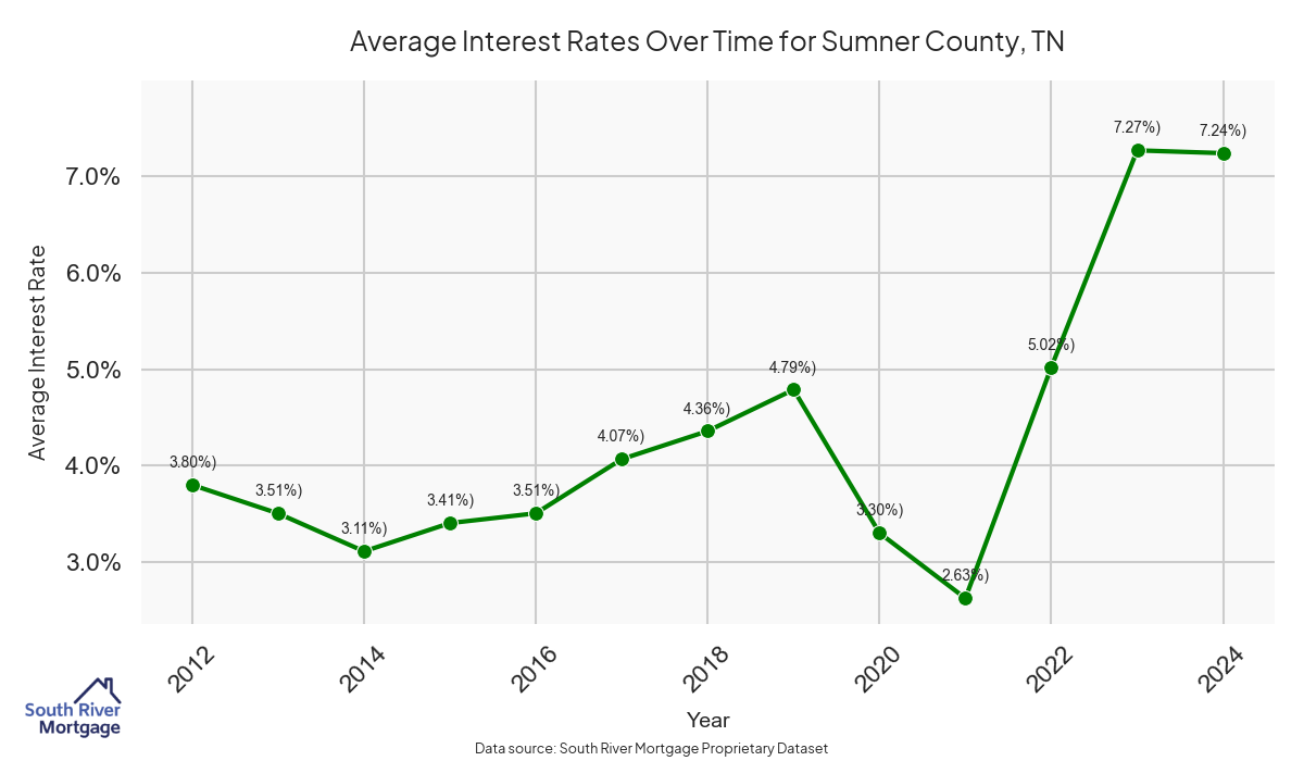 There are approximately 204 active reverse mortgage loans in Sumner County. The average interest rate in Sumner County is 7.52% for reverse mortgages. The average maximum claim amount (the lesser of the appraisal or lending limit), among reverse mortgage borrowers, in Sumner County was $420,000.00 in 2024.