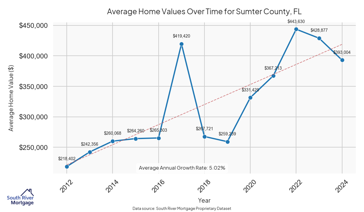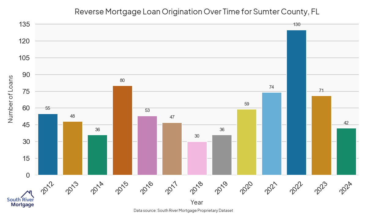 In 2024, there were 757 active reverse mortgage loans in Sumter County, Florida. The average home value in Sumter County is $443,707.45.