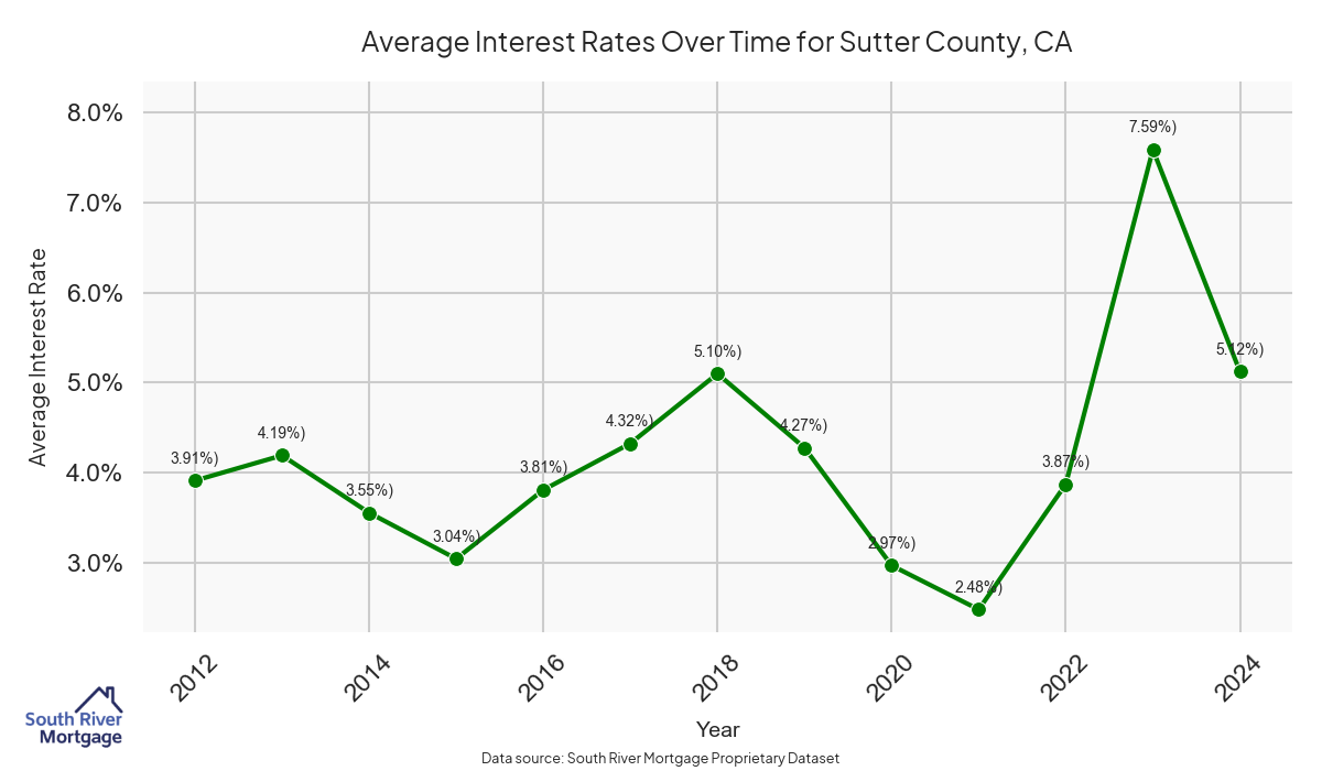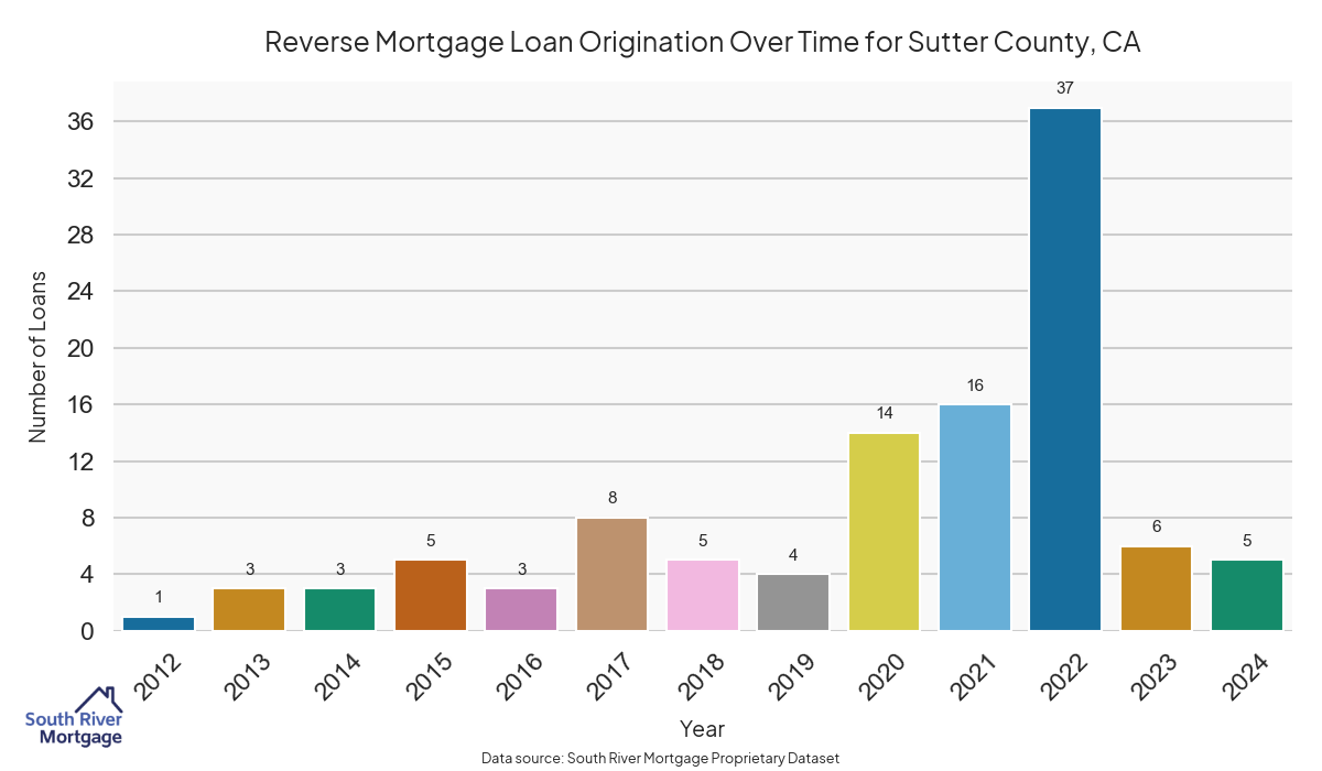 There are approximately 109 active reverse mortgage loans in Sutter County. The average interest rate in Sutter County is 7.65% for reverse mortgages. The average maximum claim amount (the lesser of the appraisal or lending limit), among reverse mortgage borrowers, in Sutter County was $479,444.44 in 2024.