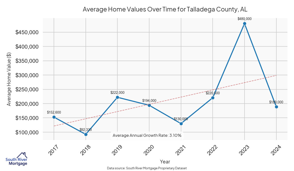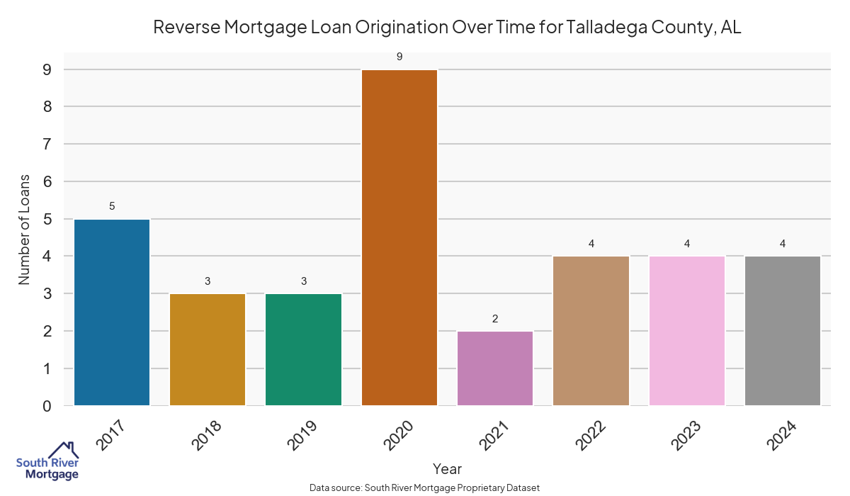 In 2024, there were 31 active reverse mortgage loans in Talladega County, Alabama. The average home value in Talladega County is $254,301.06.