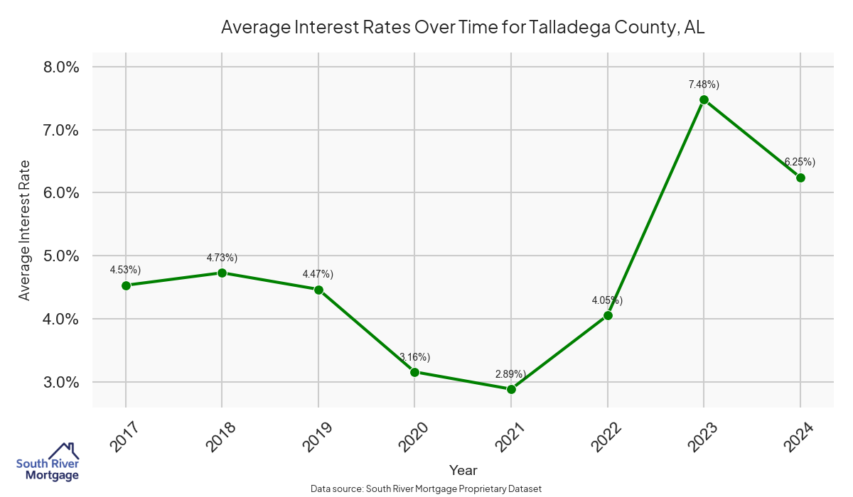 There are approximately 31 active reverse mortgage loans in Talladega County. The average interest rate in Talladega County is 7.5% for reverse mortgages. The average maximum claim amount (the lesser of the appraisal or lending limit), among reverse mortgage borrowers, in Talladega County was $470,000.00 in 2024.
